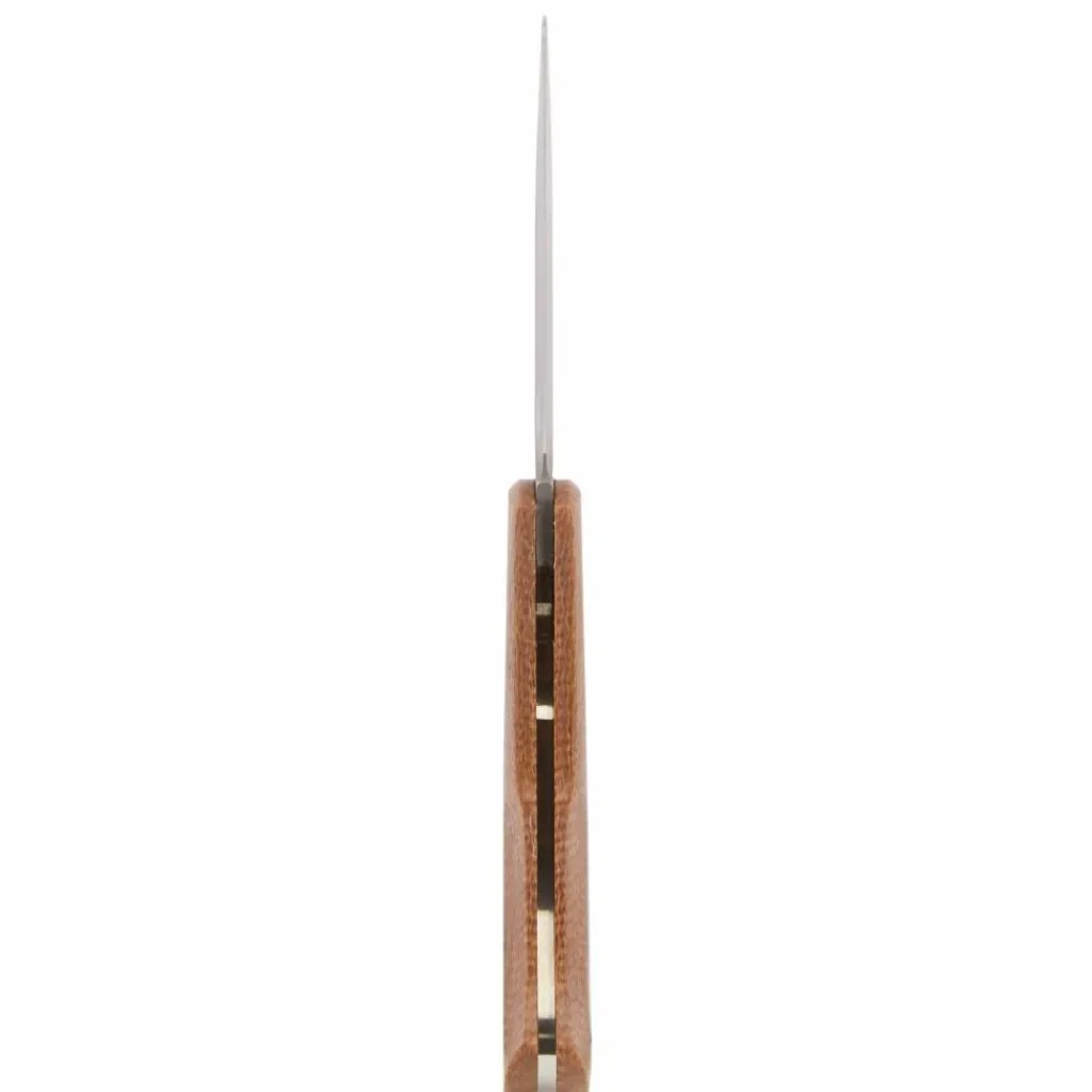 Die Griffschalen aus gefrästen Jute-Micarta sind mit dekorativen Messingnieten verarbeitet, die einen schönen Kontrast zum braunen Griff bieten. Die selbsttragende Konstruktion kommt ohne Liner und Backen aus. Durch den Slipjoint-Verschluss eignet sich das in der Messermanufaktur in Solingen hergestellte Boxer EDC hervorragend für den Alltagseinsatz.