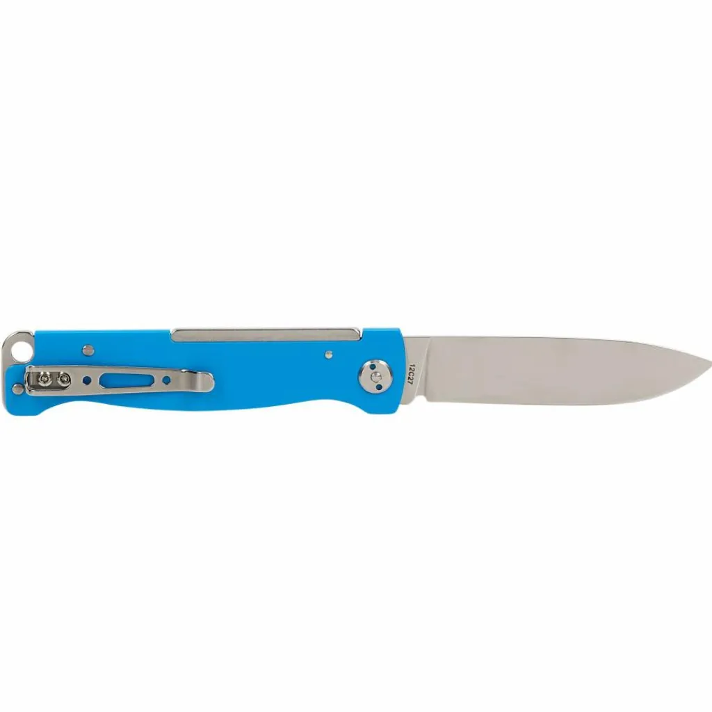 Das Atlas Blue verschwindet mit seiner 5 mm starken Bauweise nahezu unmerklich in der Hosentasche. Der blaue Edelstahlgriff bringt Farbe in den Alltag und ergänzt die polierte Klinge aus 12C27-Stahl.