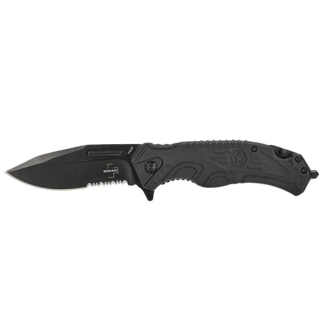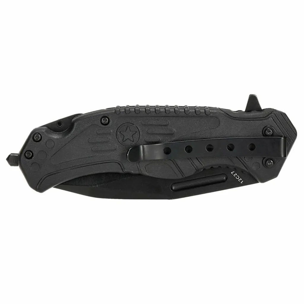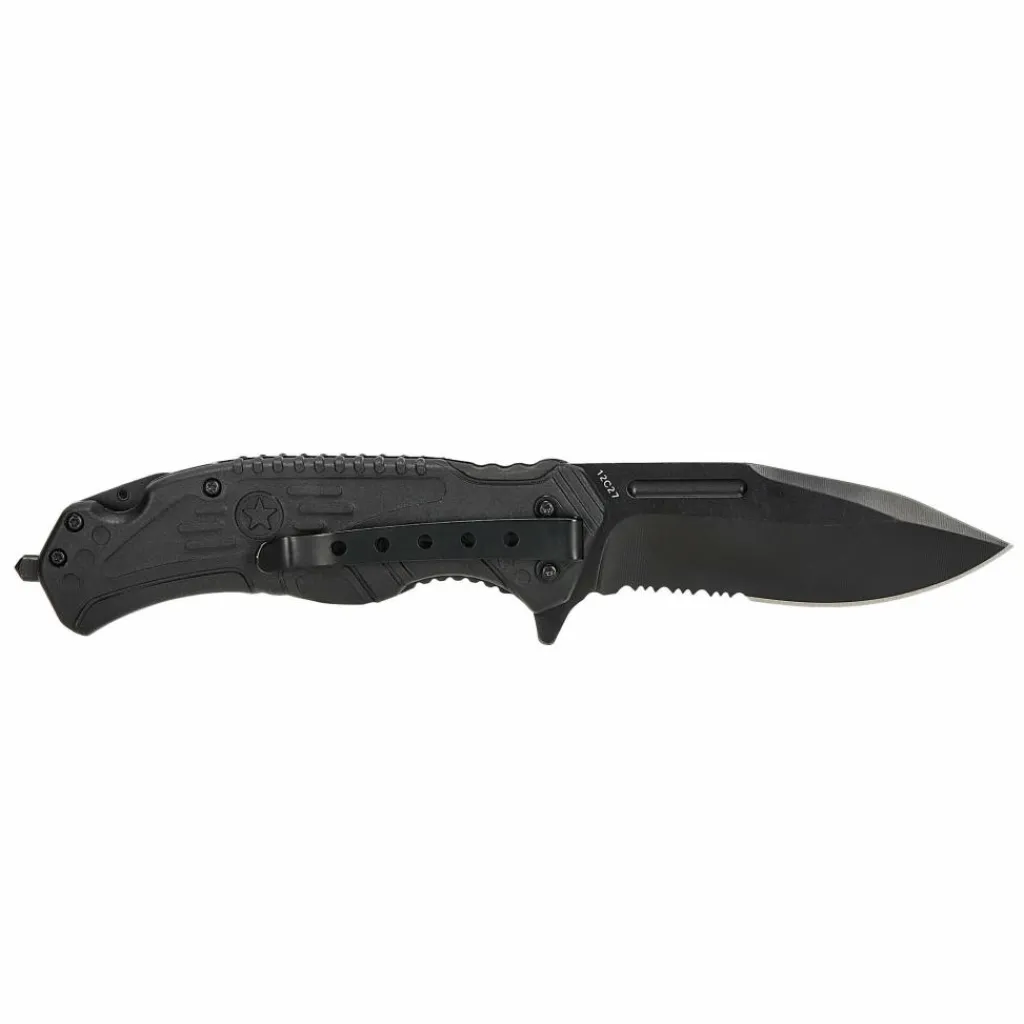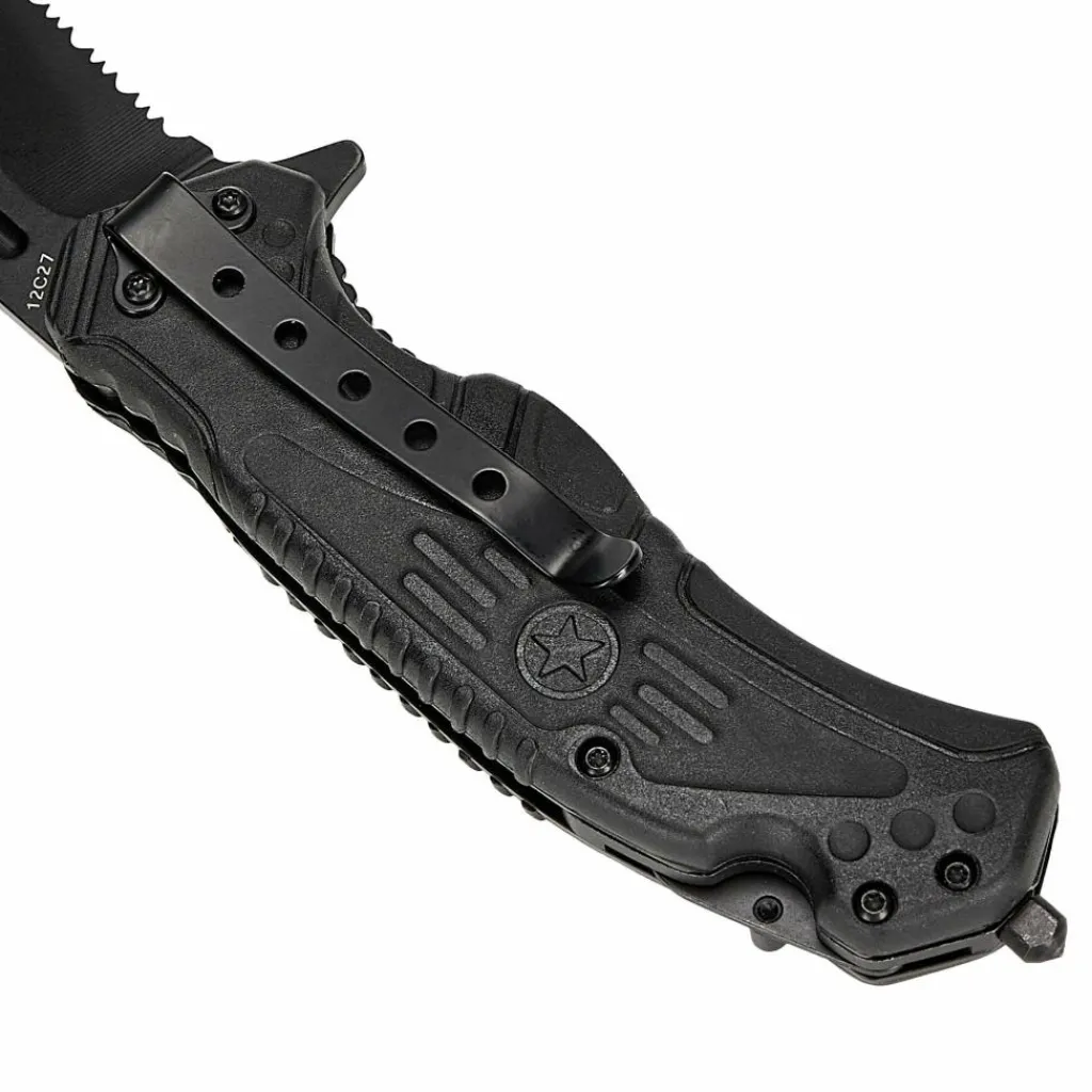 Das taktisch gestaltete Messer kann mithilfe des Flippers einhändig geöffnet werden und verriegelt automatisch dank eines Linerlocks. Der Griff ist 12,6 cm lang und eignet sich somit auch für größere Hände. In den Griffschalen aus glasfaserverstärktem Kunststoff (GFK) ist eine Schicht TPR-Gummi eingearbeitet, um sicherzustellen, dass das Messer auch mit feuchten Händen oder bei Nässe fest in der Hand liegt. Am Ende des Griffs ist ein Dorn eingeschraubt, der sich zum Einschlagen von Seitenscheiben eignet. Zudem kann eine Hakenklinge einhändig ausgeklappt werden, die sich zum Zerschneiden des Sicherheitsgurts eignet.