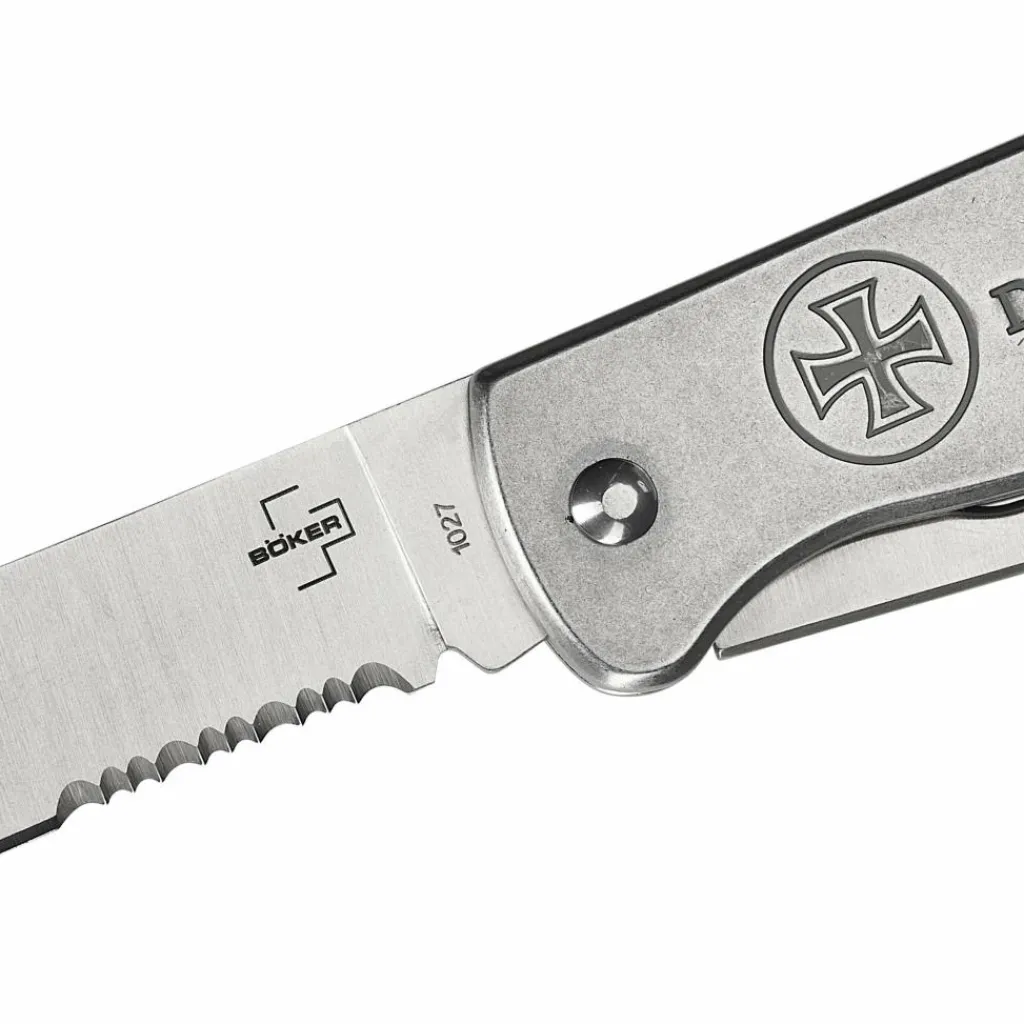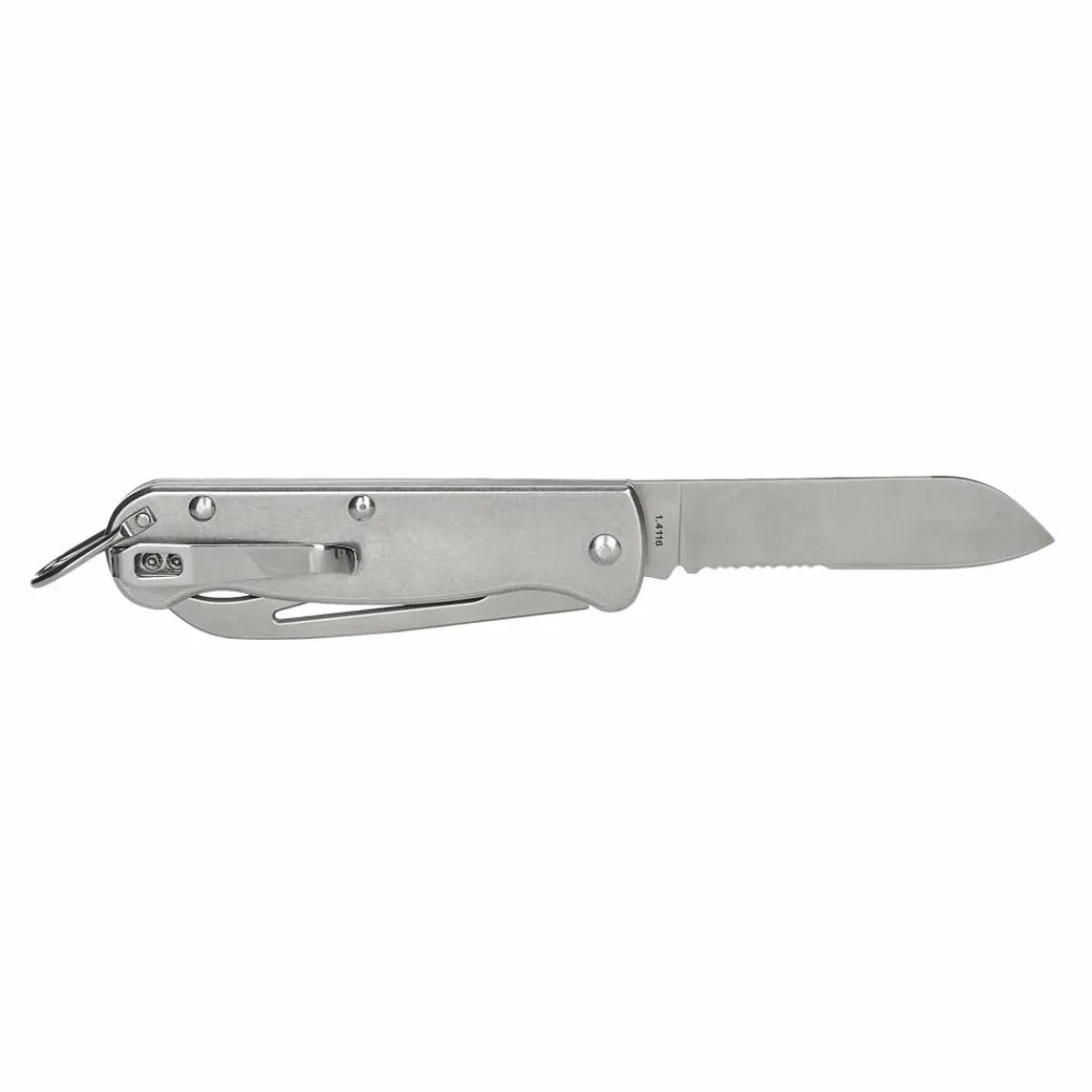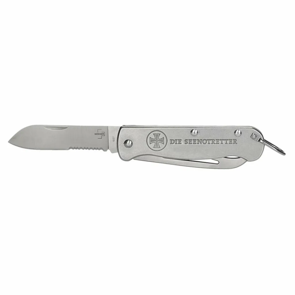 Beide Klingen werden durch einen kräftigen, schmutzunempfindlichen Slipjoint-Verschluss in Arbeitsposition gehalten. Für bedingungslose Haltbarkeit sind die Griffschalen mit kräftigen Domehead-Nieten, statt mit Schrauben versehen. Zudem befindet sich auf ihnen das Logo der Seenotretter mit Hansekreuz.
