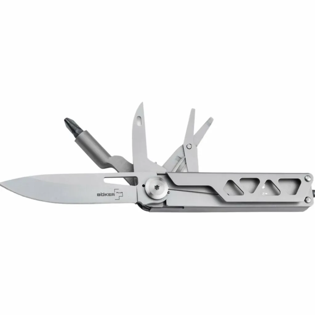 Das praktische Tool meistert so manche Aufgabe im Alltag. Ausgestattet ist es mit einer 7,9 cm langen Klinge, Bit-Halter in Standardgröße, Schere, Bohr-Stech-Ahle und einem Glasbrecher am Griffende.