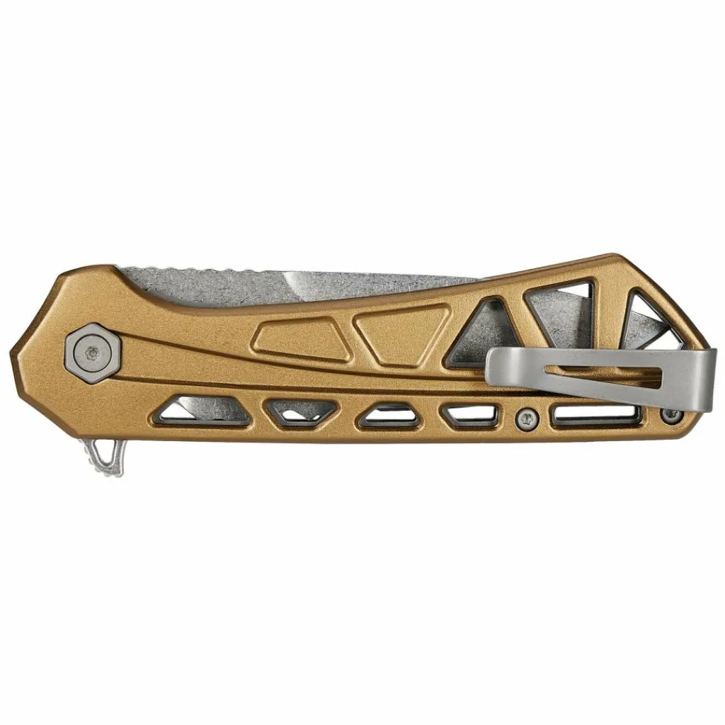 Die Klinge aus 7Cr17-Stahl ist im hinteren Teil mit einem Teilwellenschliff versehen, der dir das Durchtrennen von Schnüren und Seilen erleichtert. Der vordere Bereich ist glatt geschliffen und für klassische Schneidaufgaben ausgelegt. Der kugelgelagerte Flipper hilft dir, die Klinge in Arbeitsposition zu bringen, wo sie dank der Liner-Lock-Verriegelung sicher arretiert. Für ein besseres Handling sorgen der ergonomische Griff und die strukturierte Daumenauflage auf dem Klingenrücken. Der Hosentaschenclip ist verschraubt und kann auf beiden Seiten der Griffschalen montiert werden, was das Messer sowohl für Rechts- als auch für Linkshänder geeignet macht.