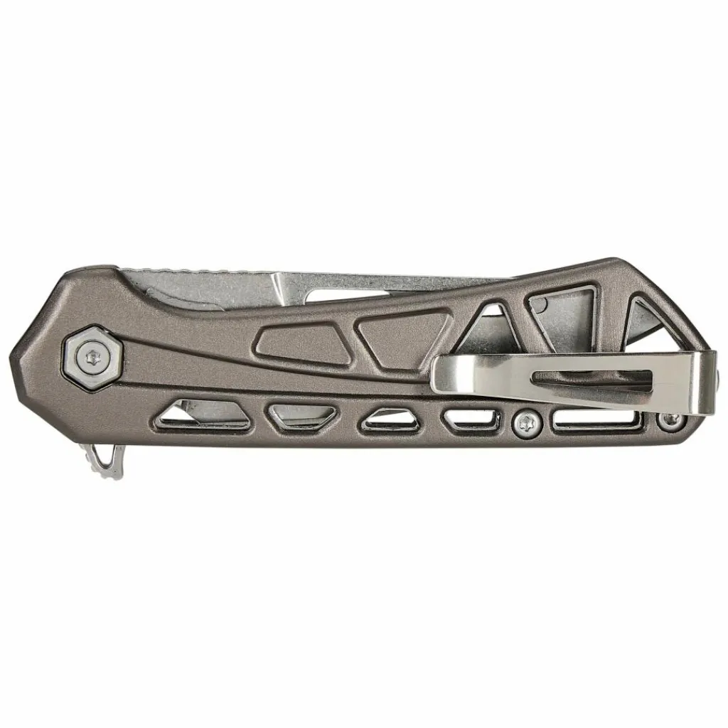 Mit einer Gesamtlänge von 15 cm, bringt das Taschenmesser gerade einmal 50 g auf die Waage. Der Hauptgrund dafür sind die mit großen Aussparungen versehenen, eloxierten Aluminium-Griffschalen. Die graue Eloxierung unterstreicht dabei das leichte Design. Der kugelgelagerte Flipper lässt die Klinge mühelos in Arbeitsposition gleiten, wo sie dank des Liner-Locks sicher verriegelt. Bei präzisen Arbeiten unterstützt die strukturierte Daumenauflage auf dem Klingenrücken eine sichere Handhabung. Für den Transport kannst du den verschraubten Hosentaschenclip sowohl links- als auch rechtsseitig an den Griffschalen befestigen, wodurch das Messer für Links- und Rechtshänder gleichermaßen schnell zur Hand ist.