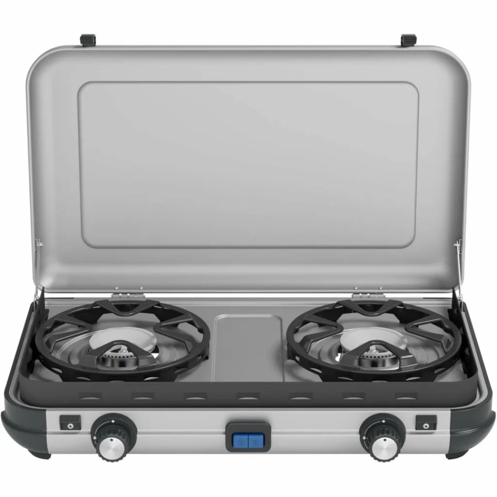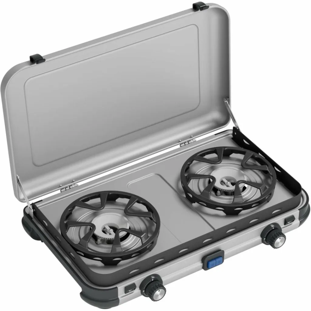 Der Camping Kitchen 2 Maxi ist mit zwei großen Kochflächenausgestattet, die Töpfe und Pfannen bis 28 cm Durchmesser aufnehmen können. Zwei getrennt regelbare Brenner leisten je bis zu 1800 Watt.