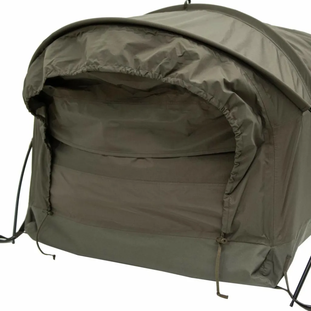 Das Observer Plus lässt sich freistehend aufbauen und bildet dank der beiden kreisförmig geformten Gestängebögen eine stabile Kuppelstruktur am Kopfende. Der Zugang erfolgt über eine praktische L-förmige Seitenöffnung mit zwei Reißverschlüssen.