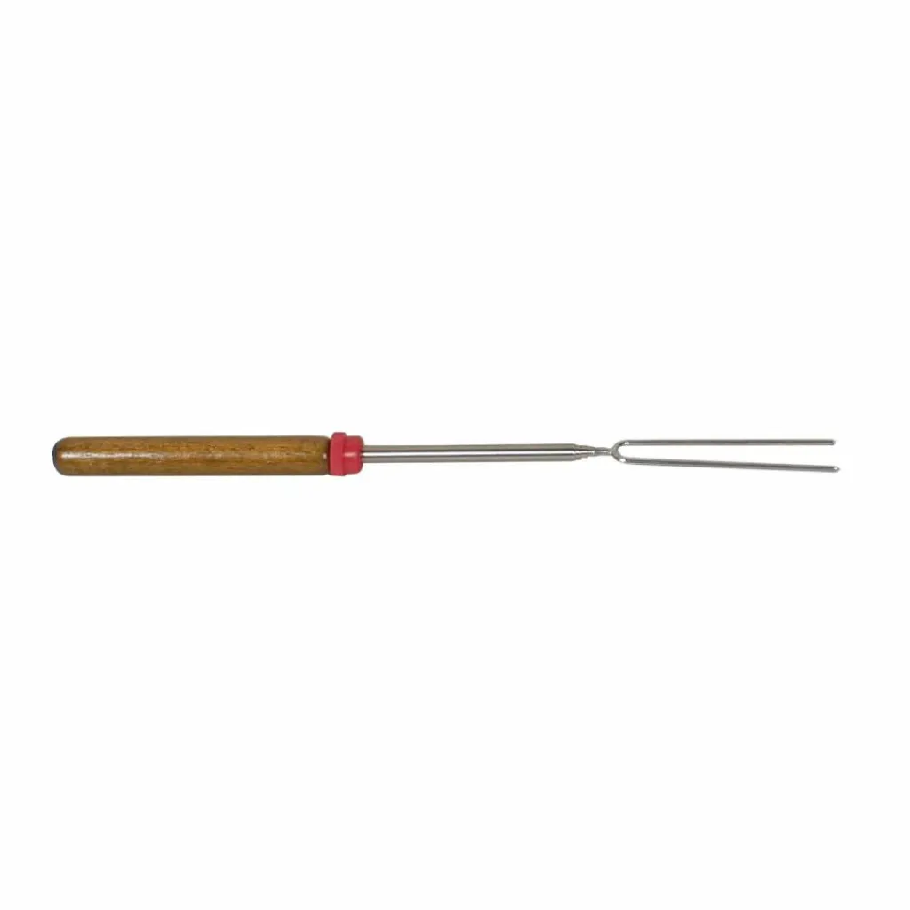 Die Grillgabel kann auf eine Länge von 86 cm ausgezogen werden. Der Holzgriff schützt die Hände vor Verbrennungen, während Würstchen und Marshmellows über dem Feuer brutzeln.