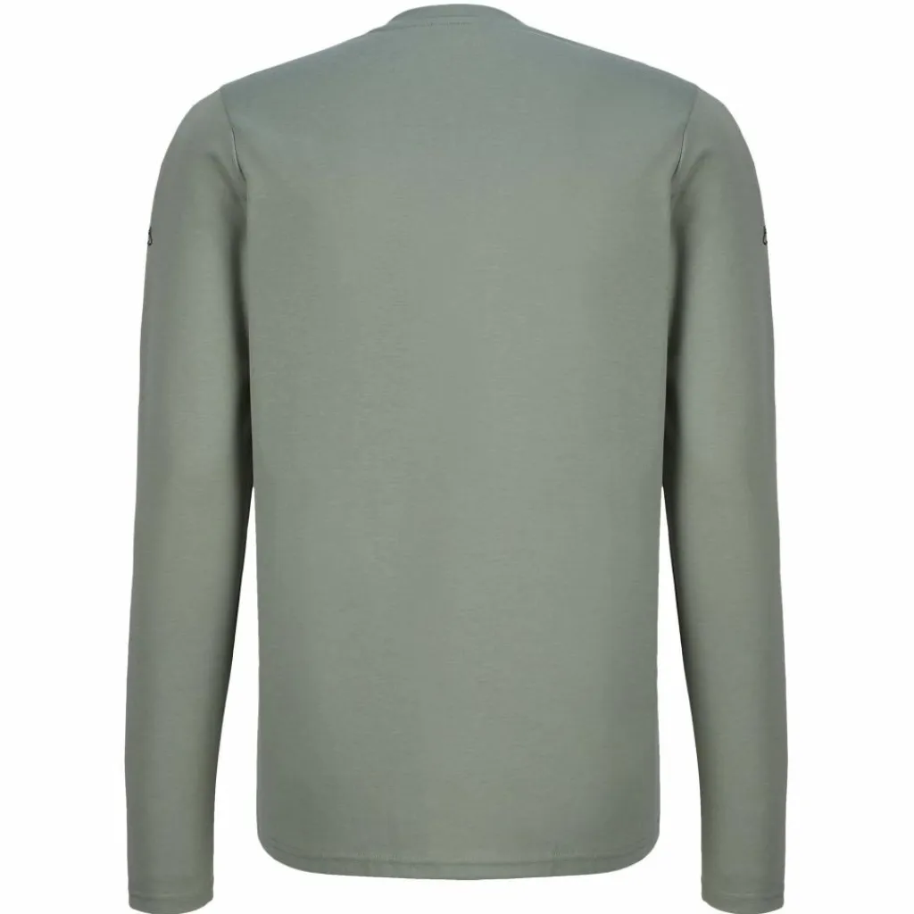 Das Materialtrio dieses Langarmshirts setzt sich aus recyceltem Polyester, weicher Baumwolle und dehnbarem Elasthan zusammen. Die Kunstfaser steuert das gute Feuchtigkeitsmanagement bei. Wenn du in warmen Gefilden ins Schwitzen gerätst, wird die Feuchtigkeit nach außen geleitet. Durch das Materialgemisch trocknet das Shirt schneller wieder als eins aus reiner Baumwolle. Diese ist allerdings für die ansprechende Haptik und das angenehme Tragegefühl zuständig.