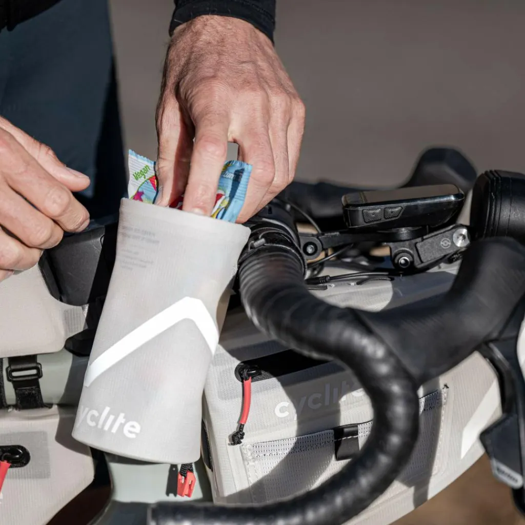 Die Stem Bag der superleichten Sorte: Mit dieser offenen Tasche an deinem Vorbau hast du alles Mögliche ganz einfach und fix zur Hand; ob Energieriegel, Snacks, Trinkflasche, Armlinge oder Handschuhe.
