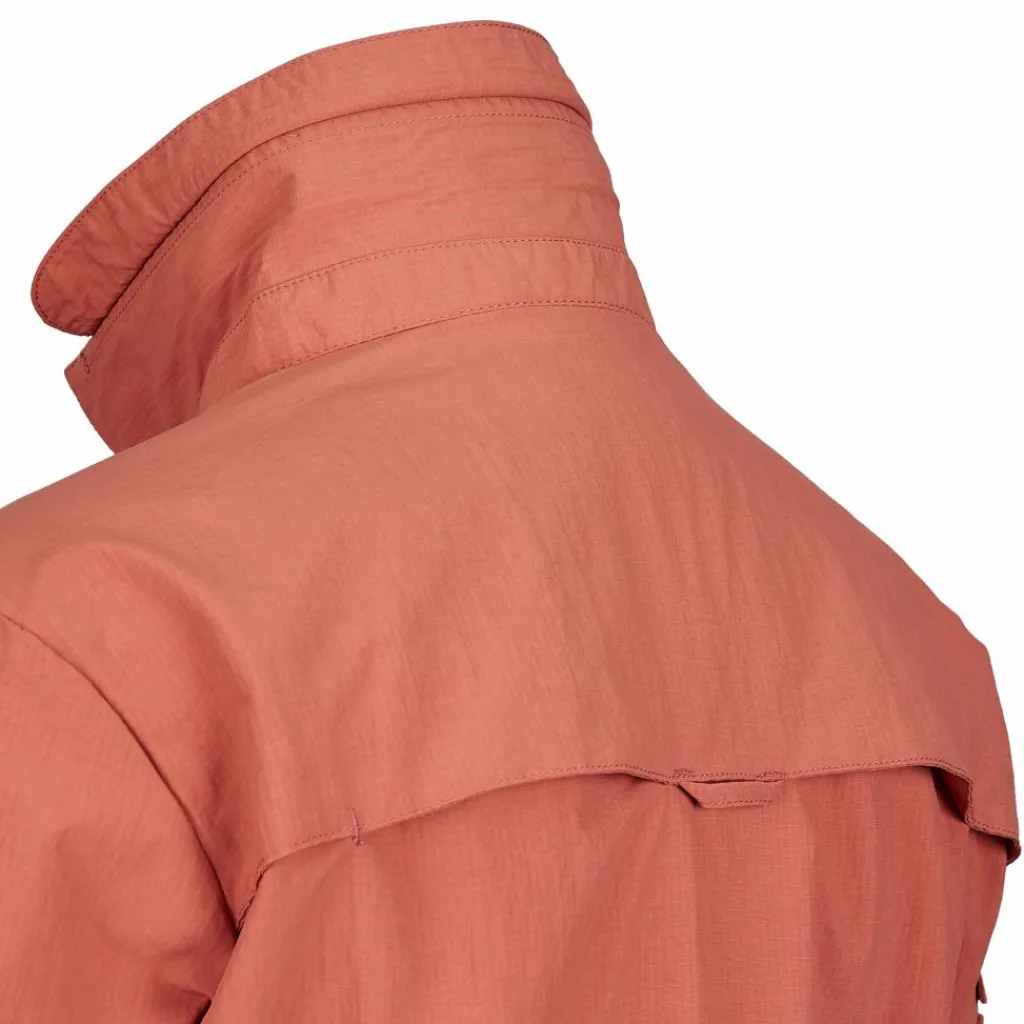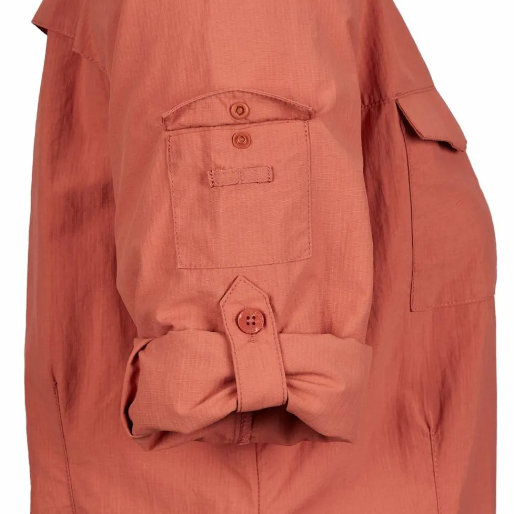 Die Ärmel der Langarmbluse lassen sich ganz einfach zum Kurzarm aufrollen und mit Lasche und Knopf fixieren. Der klassische Kragen kann zum Schutz vor der Sonne doppelt ausgeklappt werden. Für Stauraum sorgen einige Taschen. Eine lässt sich sogar durch einen kleinen Karabinerhaken verschließen.