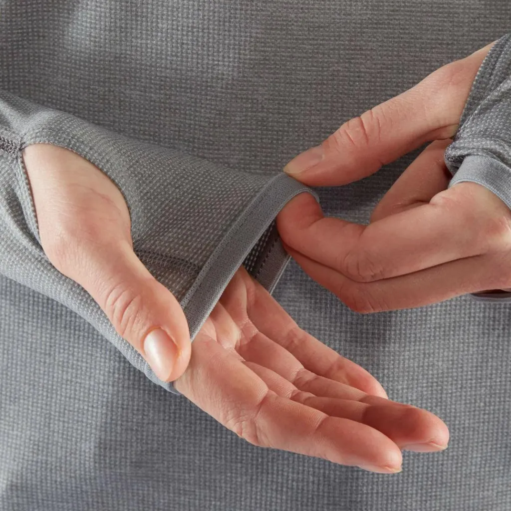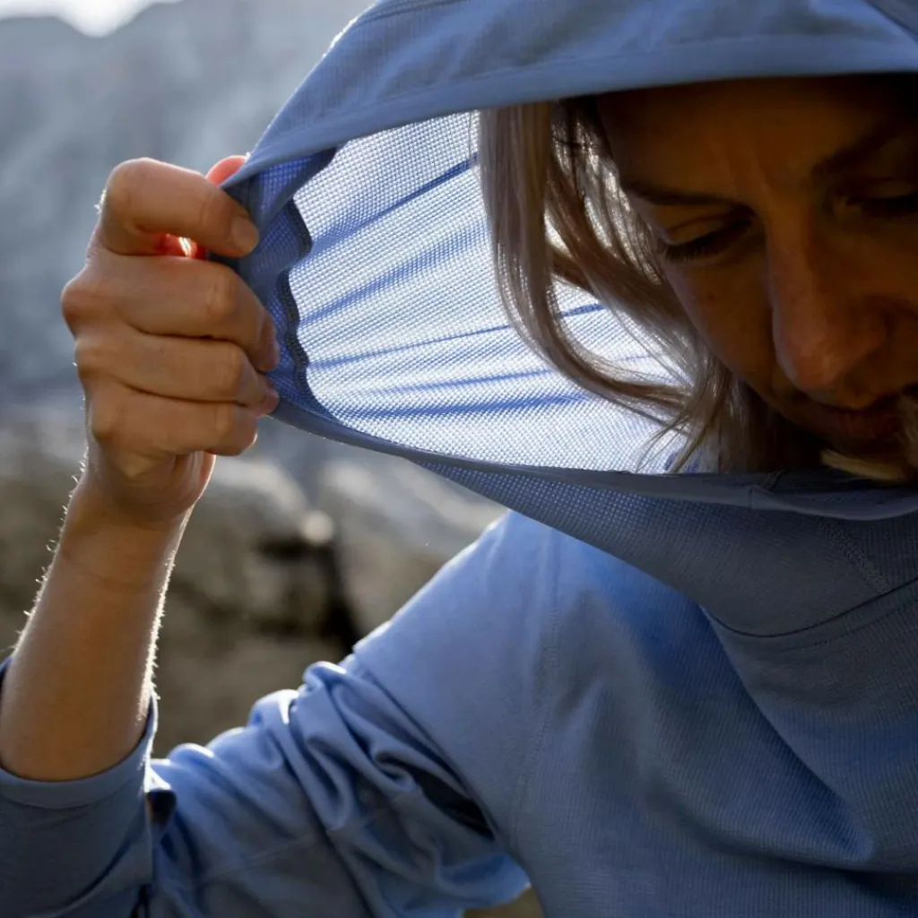 Ein Unterarmzwickel unterstützt die Beweglichkeit. Die Kapuze ist körpernah geschnitten und kann dadurch auch unter einem Kletter- oder Fahrradhelm getragen werden. Der Hoodie verfügt außerdem über Daumenschlaufen, die zum einen selber wärmen, zum anderen aber auch dafür sorgen, dass der Kapuzenpullover nicht verrutscht.