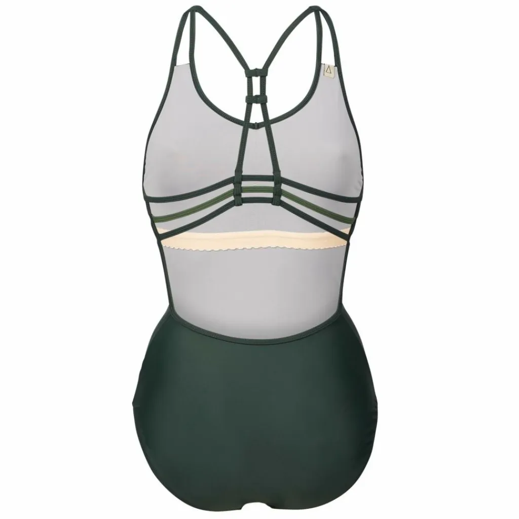 Der Badeanzug ist mit einem innenliegenden Bustier ausgestattet. Dieser Bereich ist zudem für noch besseren Halt mit einem dreilagigen Innenfutter versehen. Der Badeanzug kann aber auch durch herausnehmbare und wattierte Einlagen ergänzt werden.