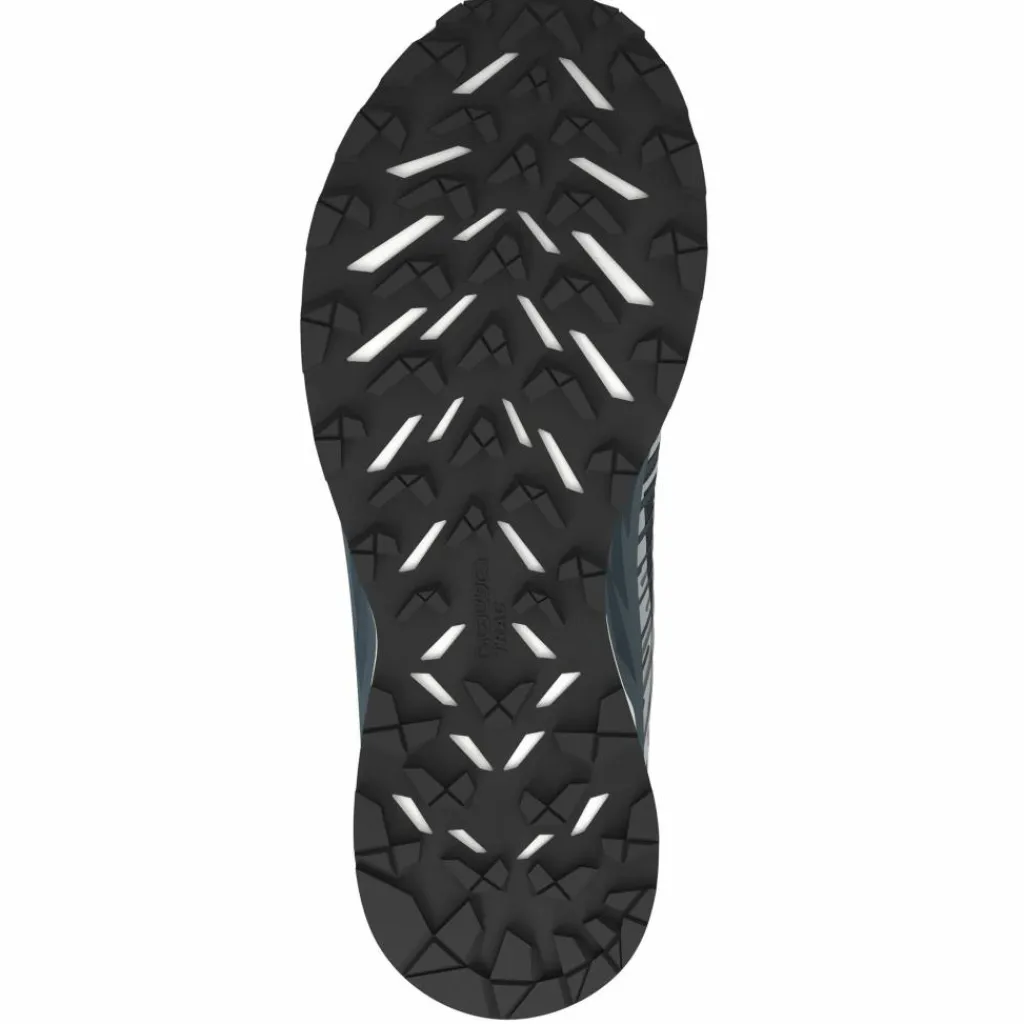 Auffallend sind auch die tiefen Stollen der Laufsohle. Diese haben die Funktion, sich auch auf sehr weichen Untergründen problemlos Halt verschaffen zu können. Auch verfügt der Trailrunningschuh über eine „Rebound-Plate“ im Vorfußbereich. Dabei handelt es sich um eine carbonverstärkte Zwischensohle, die die Energie beim Auftritt speichert und beim Heben des Fußes wieder abgibt.