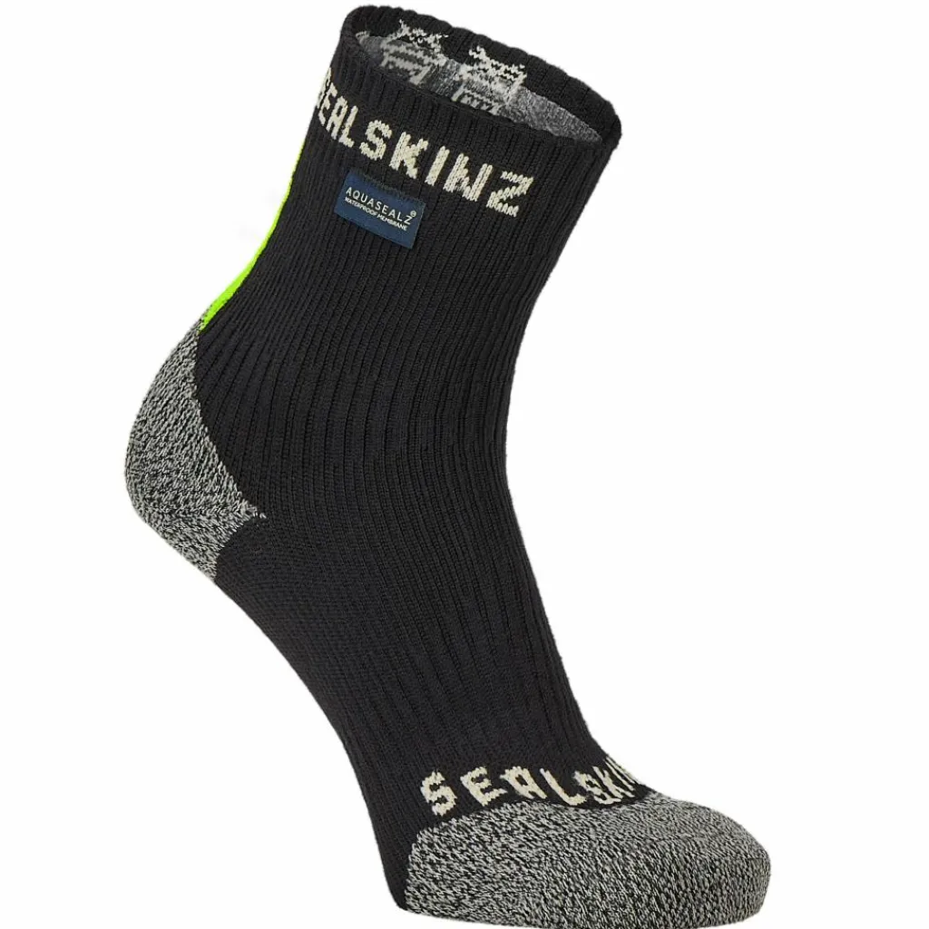 Die Wolle, die neben anderen Fasern innen zum Einsatz kommt, sorgt für ein angenehmes Tragegefühl und wirkt außerdem geruchshemmend. Zwischen Außen- und Innenmaterial sitzt die Sealskinz Aquasealz-Membran, die die Dunton wasserdicht sowie atmungsaktiv macht. Wasser dringt nicht ein, innen entstehende Feuchtigkeit kann aber entweichen. Gleichzeitig sorgt das Hydrostop-Bündchen am Abschluss der Socke dafür, dass kein herablaufendes Wasser vom Bein in die Socke eindringt. Die nahtlose Konstruktion verhindert die Bildung von Blasen.