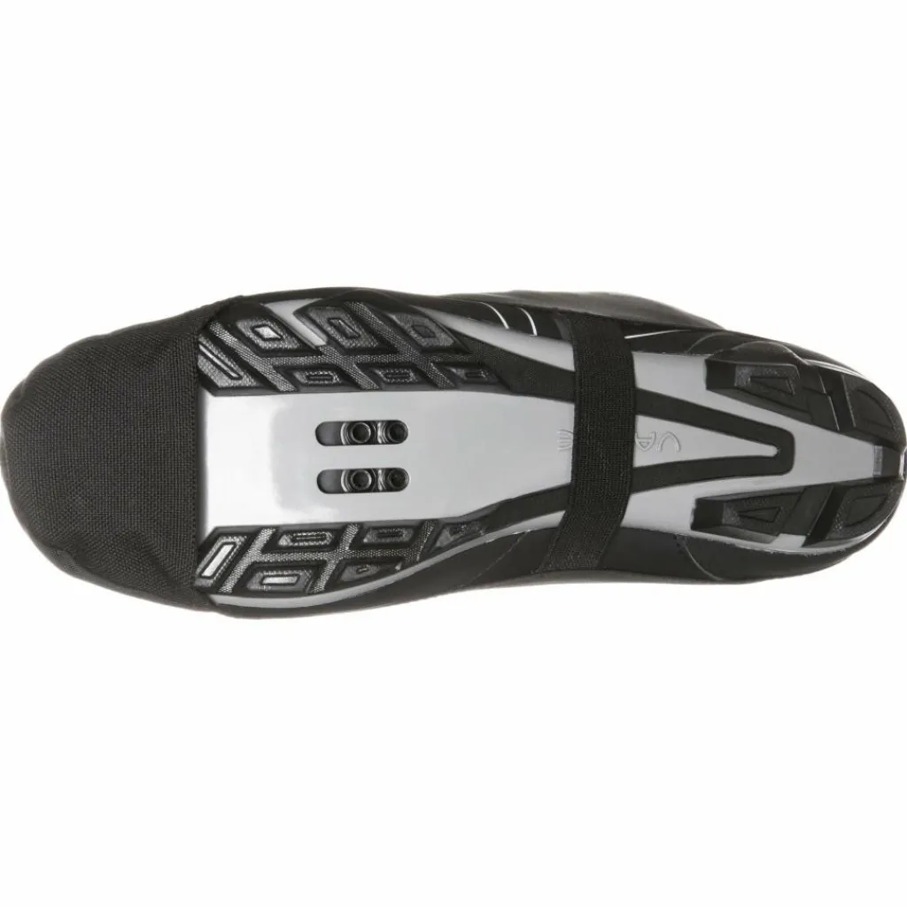 Die Überschuhe sind mit einem durchgehenden Klettverschluss an der Rückseite ausgestattet, wodurch du sie bei Bedarf einfach überziehen kannst. Die Sohle ist, von der Fußspitze abgesehen, offen. Ein Gummi unter dem Mittelfuß hält die Überschuhe in Position. Der Klettverschluss auf dem Spann dient zur Weitenanpassung. Für Schuhe mit SPD-Cleats geeignet.