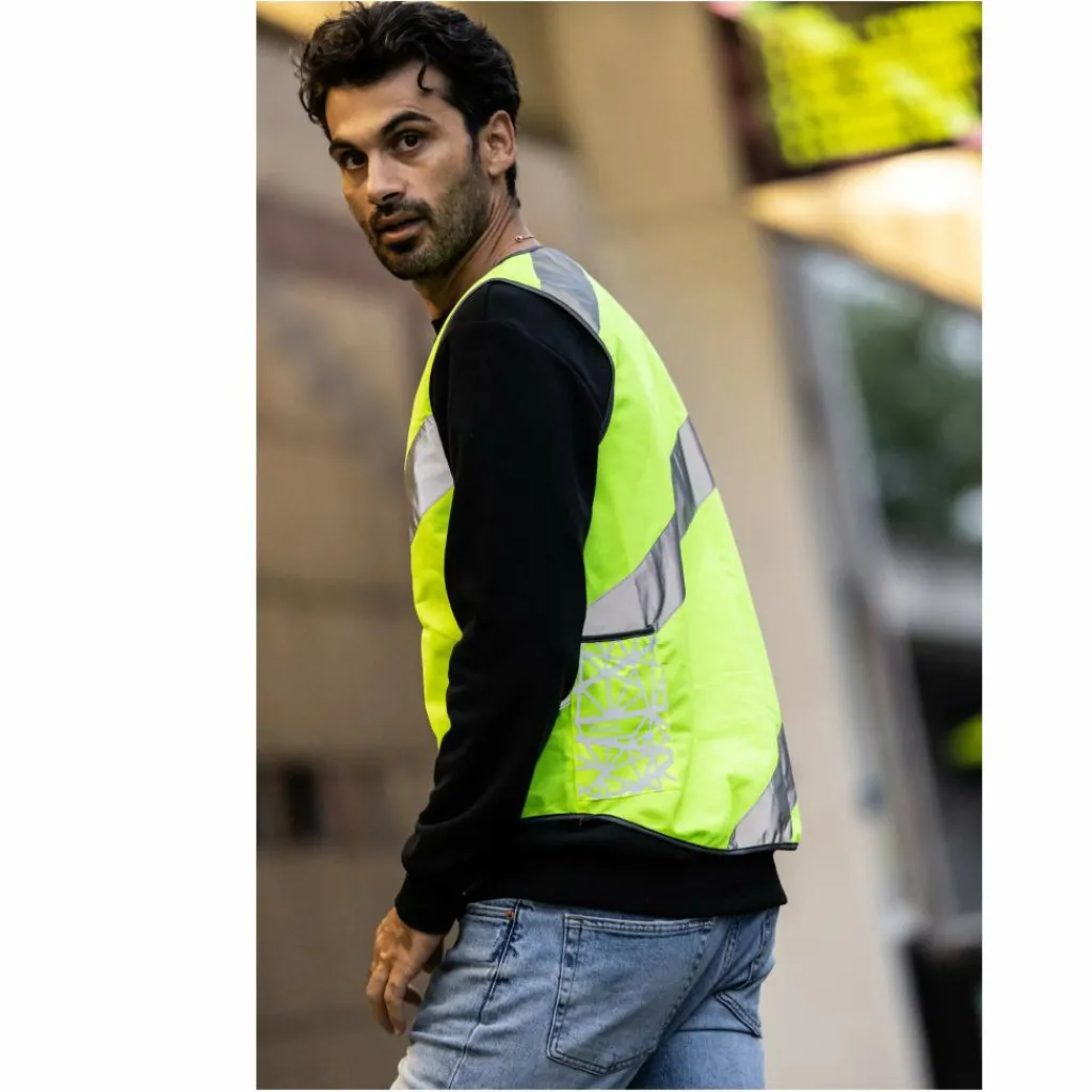 Weste in leuchtendem Gelb plus breite Reflexstreifen: Das ergibt viel Sichtbarkeit auf der Straße – und die Aufmerksamkeit anderer Verkehrsteilnehmer ist dir gewiss.