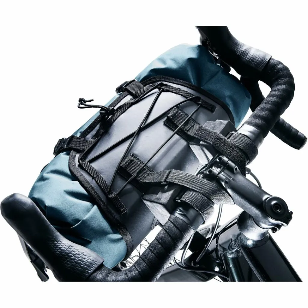 Lenkertaschen-Kombination aus leichtem, wasserdichtem Packsack mit beidseitigem Roll-Top und Komprimierungsventil sowie Lenkertasche aus strapazierfähigem Material mit elastischem Kompressionszug und Materialschlaufen auf der Oberseite. Ermöglicht schnelles Be- und Entladen bei spontanen Zwischenstopps, da die Taschenhalterungen am Fahrrad belassen, während der Packsack mitgenommen werden kann. Die robusten Gurtbänder können dank Klettverschluss zur Verdrehsicherung und mitgelieferter Distanzstücke an unterschiedlichste Rohrdurchmesser angepasst werden und sind auch für Carbon-Fahrräder geeignet.