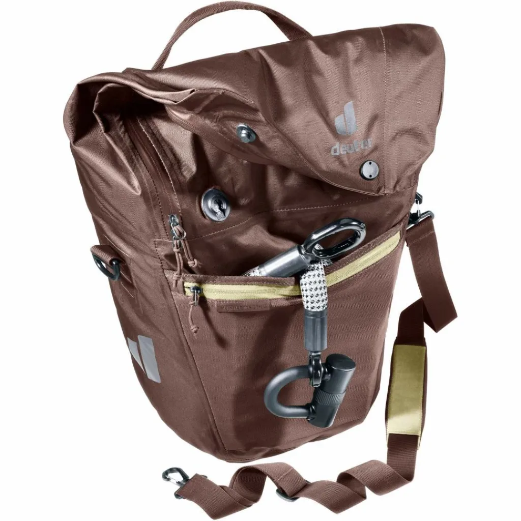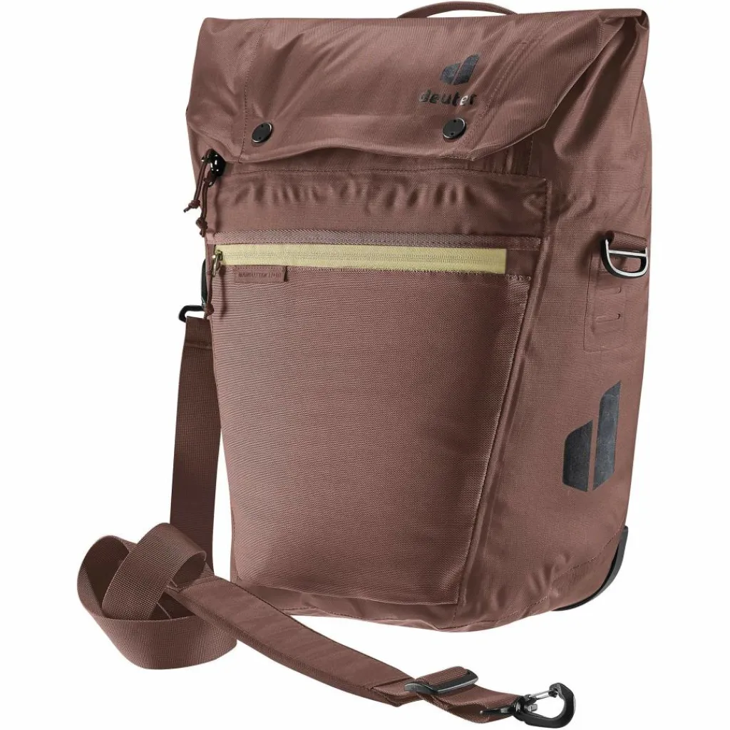 Die multifunktionale Fahrradtasche findet ihren Einsatz als Einkaufs- oder Aufbewahrungstasche am Hinterrad oder, dank einzippbarer Organisationseinheit für Arbeitsunterlagen, als Umhängetasche fürs Büro. Das wasserdichte Material bietet zuverlässigen Schutz vor dem Eindringen der Nässe. Die neue BagFix-Halterung sorgt für maximale Bewegungsfreiheit, da die Last zu 100% auf dem Hinterrad und nicht auf dem Rücken des Bikers liegt und ermöglicht das Abnehmen der Tasche vom Gepäckträger in einem Handgriff. Zudem sorgt die Taschenklappe mit Magnetverschlüssen für zusätzliche 10 Liter Stauraum.