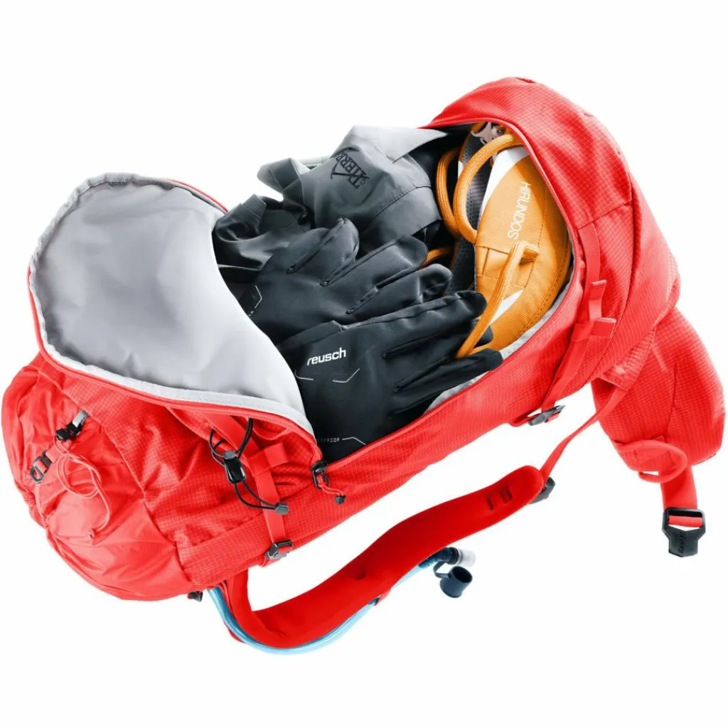 Weil Tragekomfort auch in der Vertikalen nicht zu kurz kommen darf, ist der Guide 34+6 mit Deuters Alpine Tragesystem ausgestattet. Ein gepolsterter Kontaktrücken und die schmale Form halten den Schwerpunkt des Rucksacks nah an deinem Körper, während geschwungene Schultergurte dir maximale Bewegungsfreiheit beim Klettern geben. Beim Steigen sorgt eine ergonomische Rückenplatte mit Federstahlrahmen für Packstabilität und effiziente Lastenübertragung.