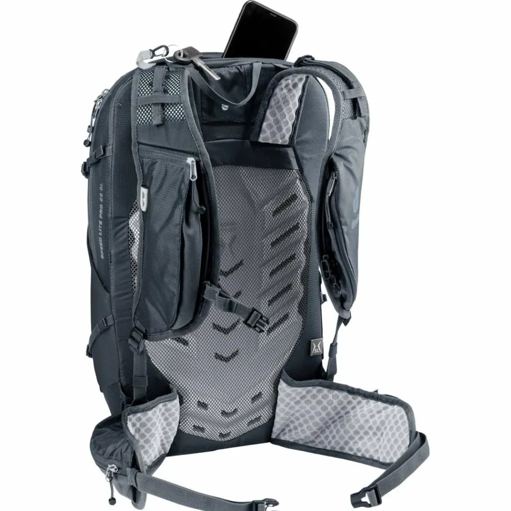 Seine sportive Natur merkt man dem Speed Lite Pro 23 SL schon an seiner durchdachten Raumaufteilung an. So bietet der Tagesrucksack insgesamt vier Fächer auf den Schultergurten und Hüftflossen, damit du auch mit geschultertem Rucksack an eine Softflask (siehe Zubehör), das Handy oder den Energieriegel kommst. Das Tragesystem ist ebenfalls für bewegungsintensive Aktivitäten ausgelegt. Ergonomische Schultergurte und ein körpernah aufliegender Kontaktrücken sorgen für einen stabilen Sitz, während Belüftungskanäle, Perforationen und ein Meshbezug ausreichend Luft an Schultern und Rücken lassen. Mit 640 g ist der Tagesrucksack zudem ein echtes Leichtgewicht.