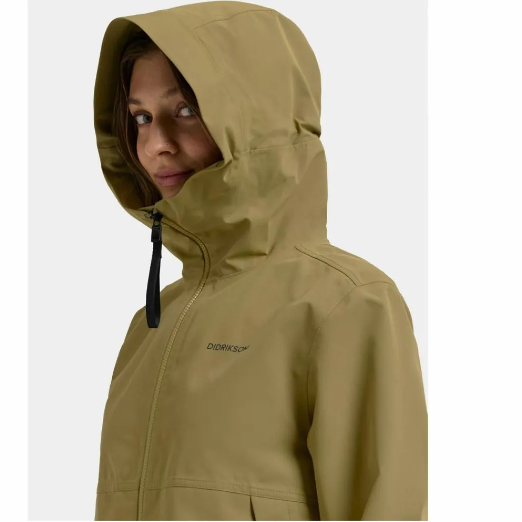 Den Zwei-Wege Front-Reißverschluss kannst du auch von unten öffnen, wenn du mehr Belüftung oder Bewegungsfreiheit benötigst. Du kannst den Reißverschluss auch offen lassen und nur die Knöpfe an der Windschutzleiste, die sich unter dem Reißverschluss befindet, schließen. So kommt mehr Luft in die Jacke, ohne dass sie vom Wind komplett aufgeweht werden kann. Die abgedeckten Taschen gehen Didriksons-typisch in die seitlichen Bewegungsschlitze über und sorgen so für einen stimmige, figurschmeichelnde Optik.