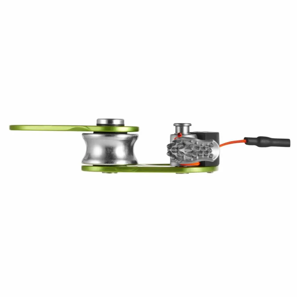Die kugelgelagerte Umlenkrolle ist aus Aluminium gemacht. Damit die Klemmnocken jederzeit einen kräftigen Biss haben, auch an vereisten oder verschmutzten Seilstücken, sind sie mit einem Reinigungsschlitz ausgerüstet.