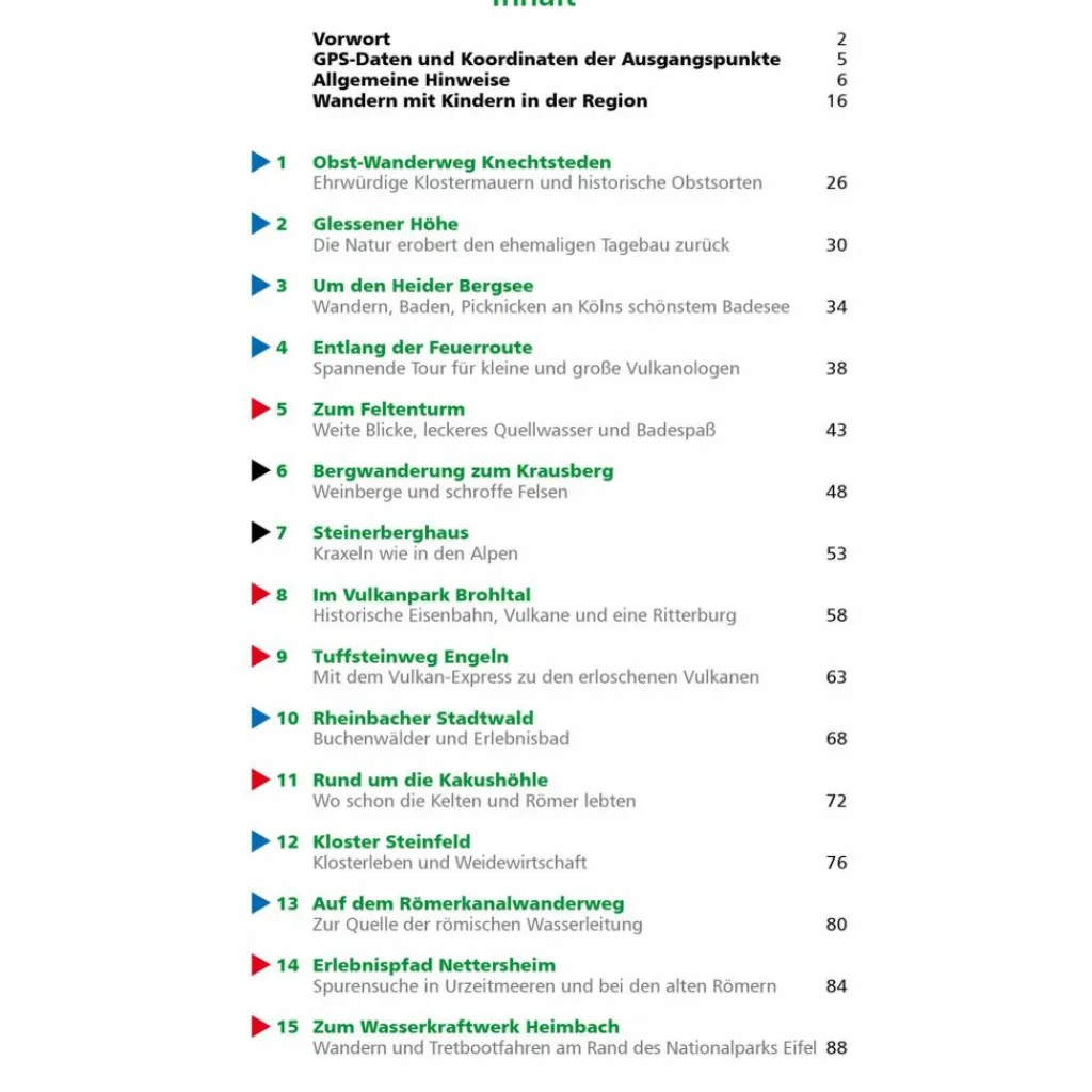 Nach ausführlicher Recherche mit ihren Kindern, Freunden und Verwandten präsentieren Oliver Welte und Mathieu Klos 35 landschaftlich reizvolle, von Kindern getestete Erlebnistouren rechts und links des Rheins zwischen Dormagen und Andernach, zwischen Aachen und Gummersbach. Die Touren folgen den Ufern von Seen und Flüssen, führen durch Wiesen- und Hügelland oder bieten weite Blicke von den Gipfeln der Mittelgebirge. Neben beinahe Bergtouren, wie im Ahrtal oder Nationalpark Eifel, finden sich mehrere Naturerlebniswege durch den Kermeter oder bei Nettersheim. Fast immer am Weg liegt ein schöner Spielplatz, ein aufregender Klettergarten oder ein erfrischendes Freibad. Hinweise auf zusätzliche Ausflugsziele sorgen dafür, dass beim Nachwuchs keine Langeweile aufkommt.