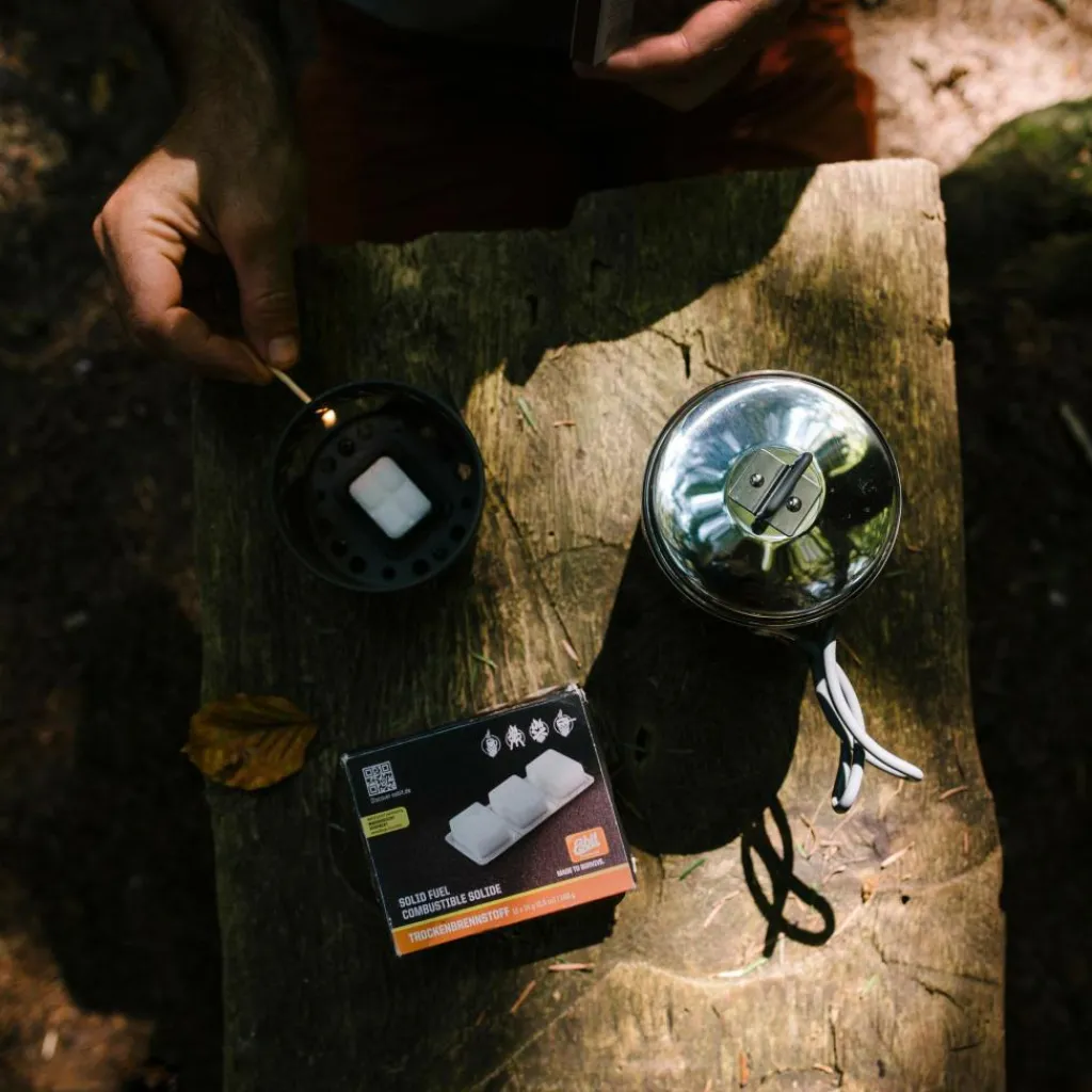 Simpel in der Bedienung und schnell einsazbereit. Einfach den Brennstoffwürfel in die Brennkammer legen, anzünden und den Topf aufsetzen. Nach einigen Minuten ist das Wasser für deinen Kaffee oder eine kleine Suppe fertig. Die unkomoplizierte Handhabung macht das Kochset ideal für den Einsatz bei Tageswanderungen, Ausflügen oder beim Angeln und Jagen.