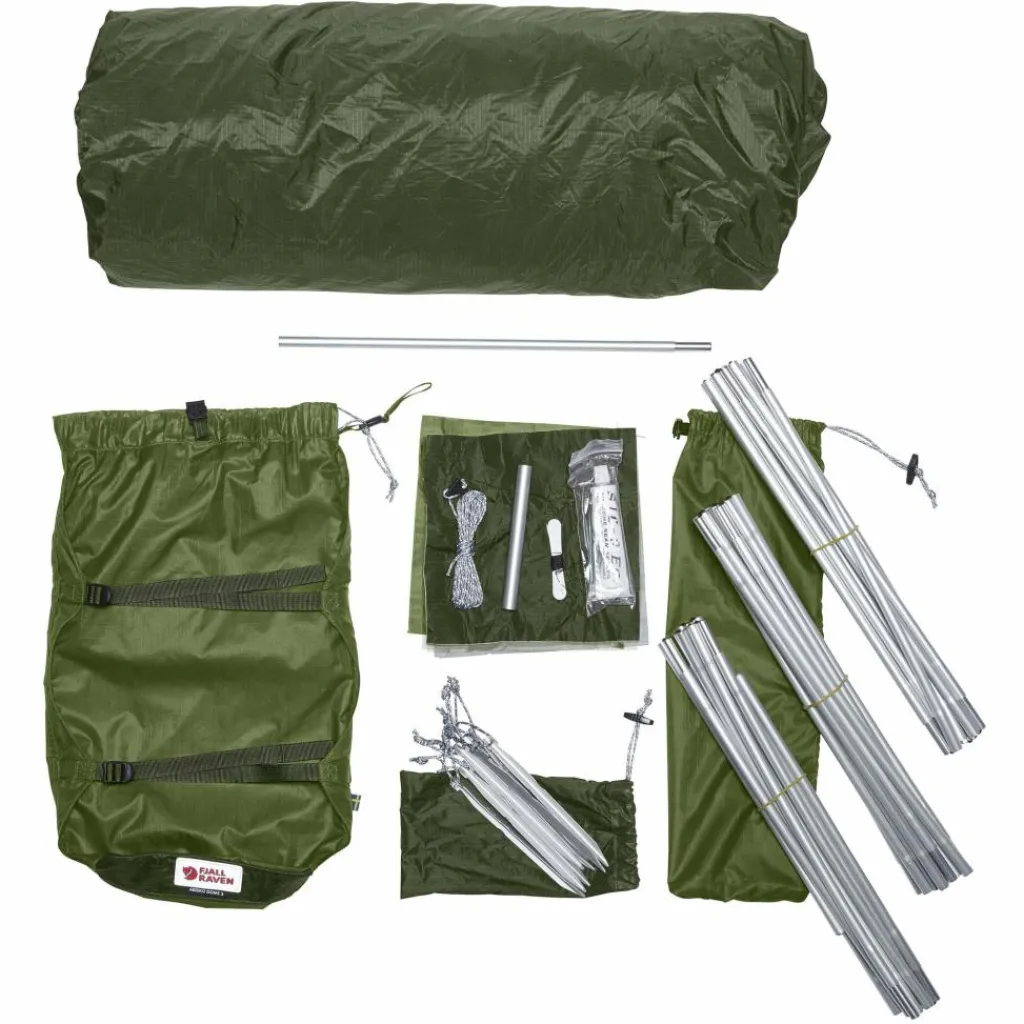 Abisko Dome 3, Gestänge, Heringe, Abspannleinen, Packsack, Reparaturhülse, Ersatzgestängesegment, Nähnadel & Faden, Ersatzzeltleine, Klebeflicken, Stoffstücke zur Reparatur (eines für jeden verarbeiteten Stoff), Anleitung