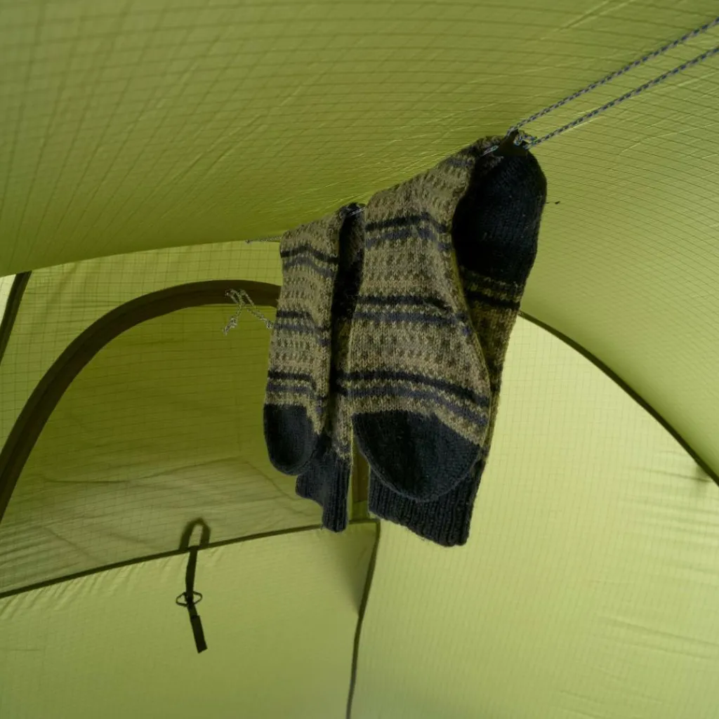 Auch die Details überzeugen. So verfügt das Abisko Endurance über eine Wäscheleine in der Apsis und im Innenraum, auf der du feuchte Ausrüstungsgegenstände über Nacht trocknen kannst. Für Ordnung im Innenzelt sorgen mehrere Netztaschen.