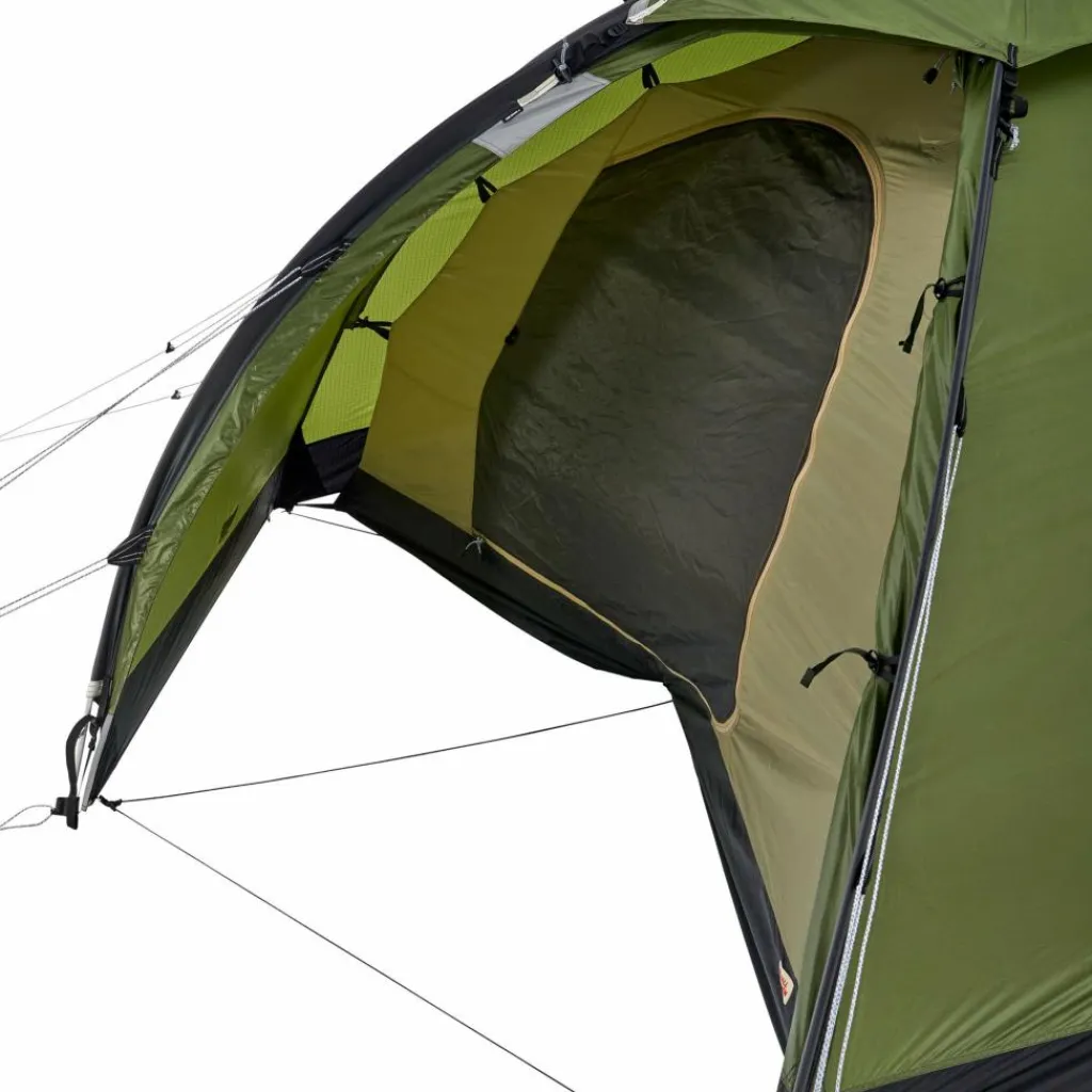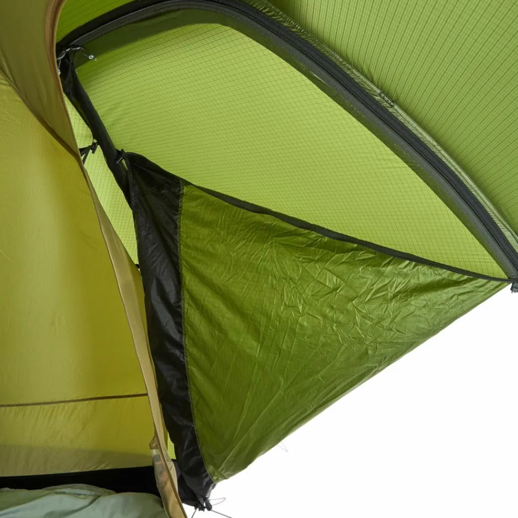 Die Außenzelttüren kannst du halb geöffnet fixieren. Das maximiert die Belüftung, ohne dass Regen ins Innenzelt tropfen kann. Die beiden großen Tieflüfter kannst du aus dem Innenzelt heraus bedienen. Sie sind mit feinem Moskitonetz versehen. Ergänzt werden sie durch zwei Deckenlüfter, für deren Bedienung du das Zelt ebenfalls nicht verlassen musst. Alle Lüfter können schneesicher verschlossen werden.