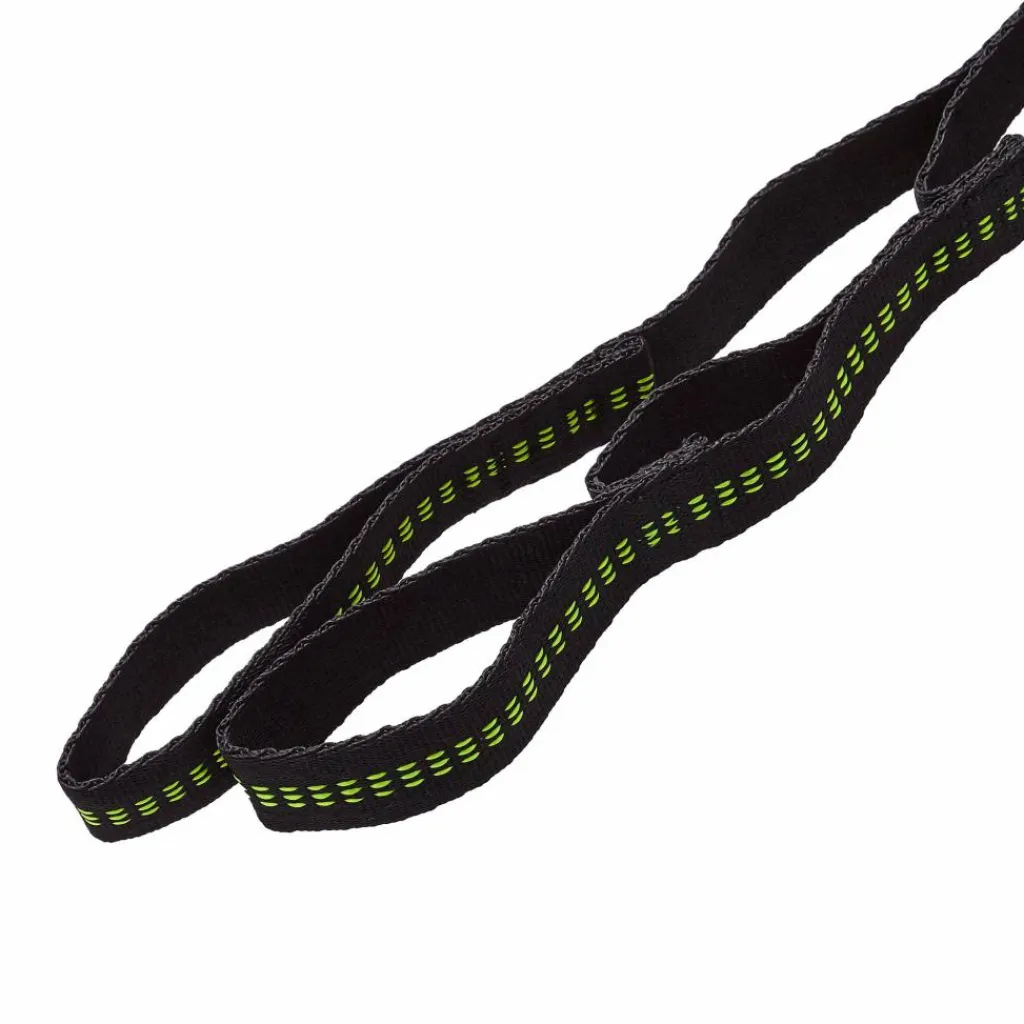 Das lange Ende wird um den Träger (z. B. einen Baumstamm) gelegt, das freie Ende mit der Hängematte verbunden. 15 Schlaufen ermöglichen eine präzise Einstellung. Zusammen sind die beiden Gurtbänder bis zu 160 Kilo belastbar.