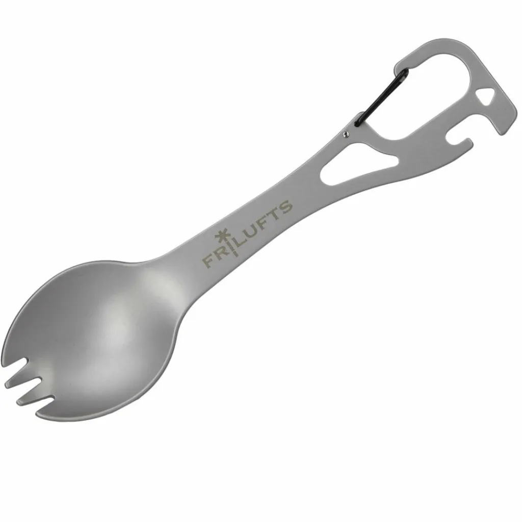 Der Göffel von Frilufts ist aus sandgestrahltem Edelstahl und multifunktional ausgestattet. Die Kombination aus Gabel und Löffel (Göffel; engl. Spork) macht ihn auch im Alltag unverzichtbar, besonders wenn du gerne unterwegs To-Go-Gerichte isst. Der Karabiner hat eine Doppelfunktion: Ihn kannst du auch als Flaschenöffner nutzen. Nach der Mahlzeit kannst du den Svinoy in der Spülmaschine reinigen.