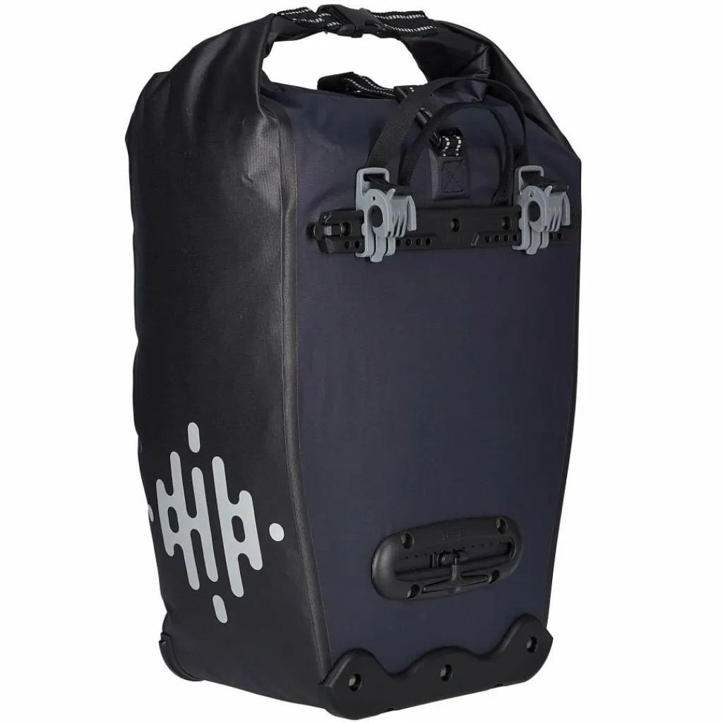 Das stabile Material ist ein 420D-Nylon, welches mit Polyurethan beschichtet ist; PVC kommt hier nicht zum Einsatz. Alle Nähte sind verschweißt, sodass du mit gerolltem Verschluss einen höchst wirksamen Schutz gegen Nässe und Staub hast. Kunststoff-Füße schonen das Material der Fahrradtasche beim Abstellen. Reflektierende Elemente direkt auf der Tasche als auch im Gurtzeug sorgen für Sichtbarkeit.