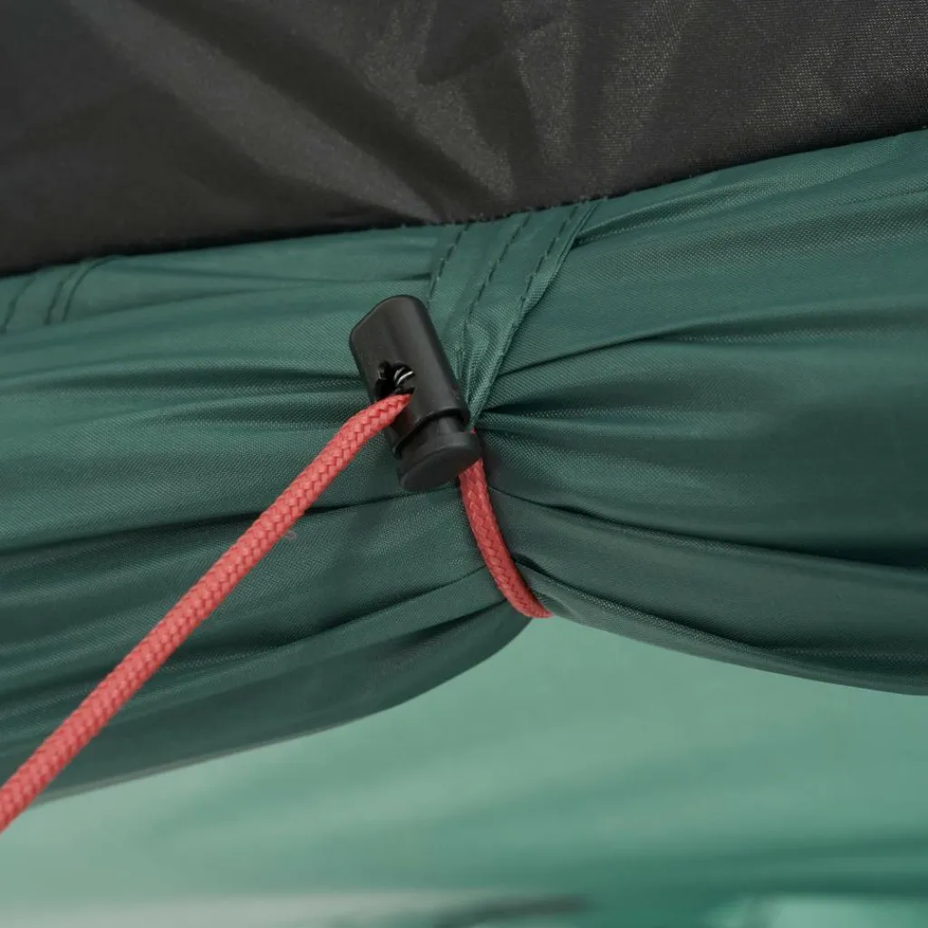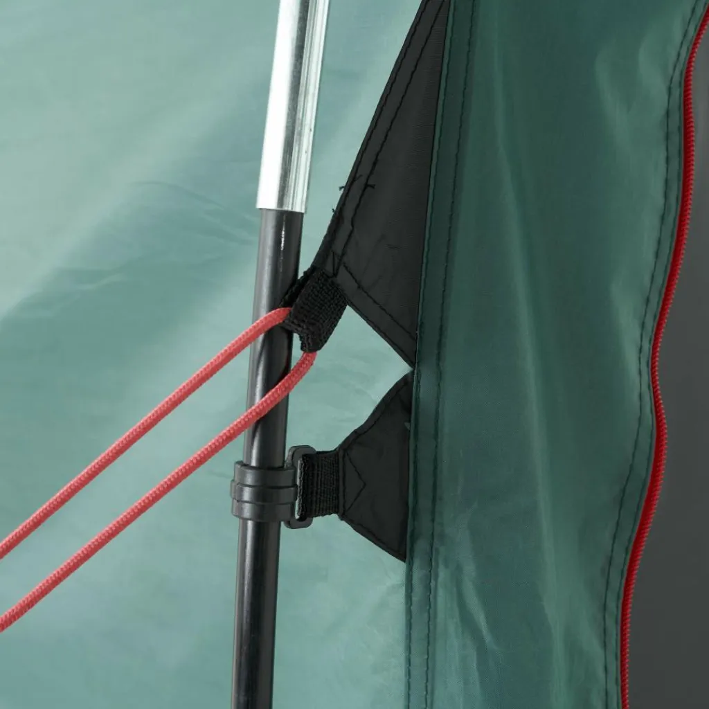 Das preiswerte Familienzelt lässt sich durch markierte Stangen und Gestängekanäle problemlos aufbauen. Trotz der Größe gelingt der Aufbau mit zwei Personen schnell. Das Innenzelt kann beim Aufbau im Außenzelt verbleiben. So wird es auch bei Regen nicht nass.