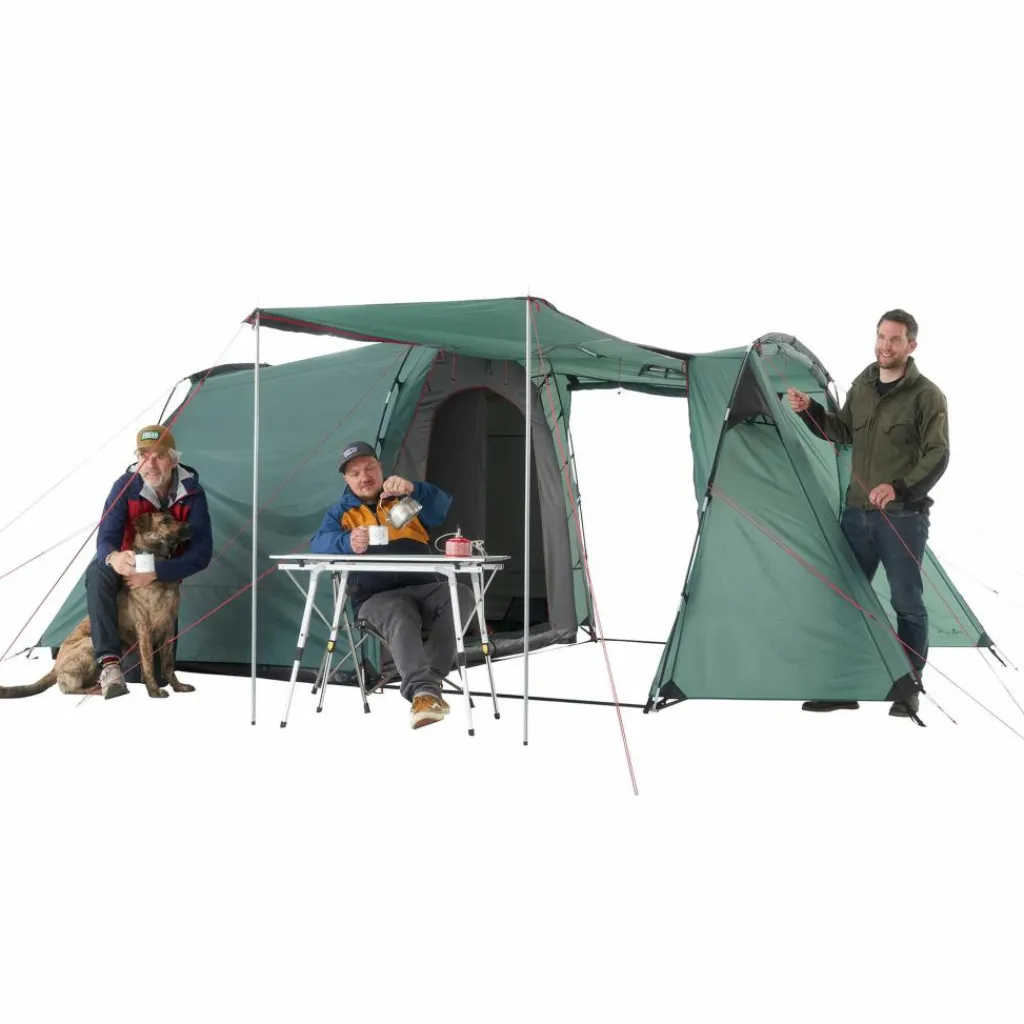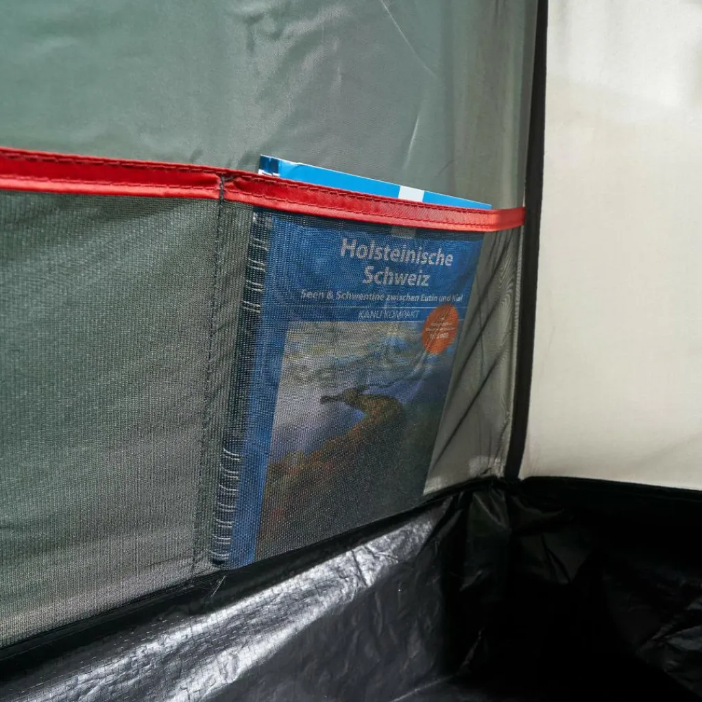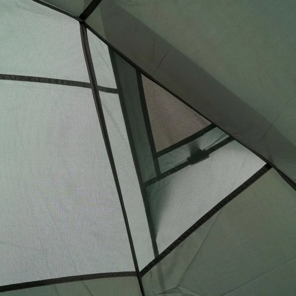 In der Apsis ist Platz für Ausrüstung oder einen kleinen Tisch mit Stühlen. Bei schönem Wetter lassen sich alle drei Eingänge aufrollen oder mit den im Lieferumfang enthaltenen Aufstellstangen aufstellen. Das Aufstellen sorgt nicht nur für besseres Klima und schönen Ausblick, sondern dient gleichzeitig als Sonnenschutz. Jede Tür verfügt über ein eigenes Fenster, das mit Stoff verschlossen werden kann.