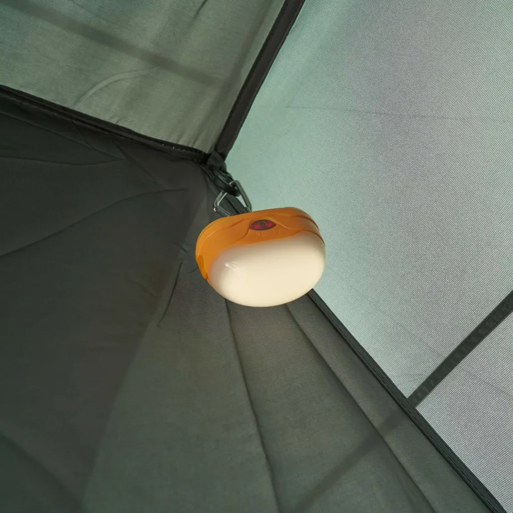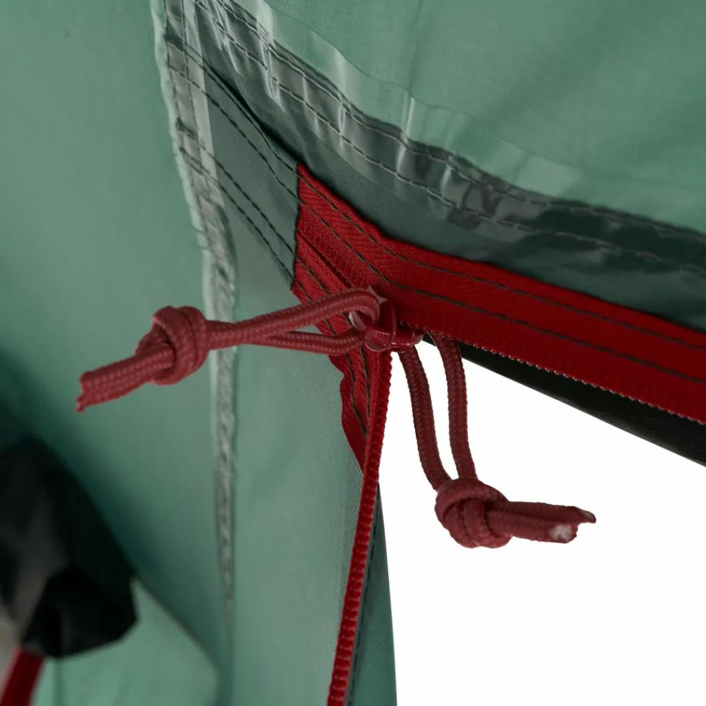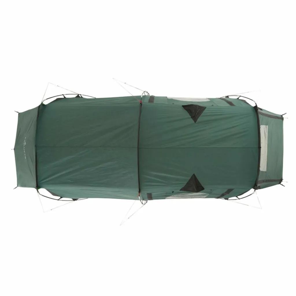 In der Apsis ist Platz für Ausrüstung oder einen kleinen Tisch mit Stühlen. Bei schönem Wetter lassen sich alle drei Eingänge aufrollen oder mit den im Lieferumfang enthaltenen Aufstellstangen aufstellen. Das Aufstellen sorgt nicht nur für besseres Klima und schönen Ausblick, sondern dient gleichzeitig als Sonnenschutz. Jede Tür verfügt über ein eigenes Fenster, das mit Stoff verschlossen werden kann.