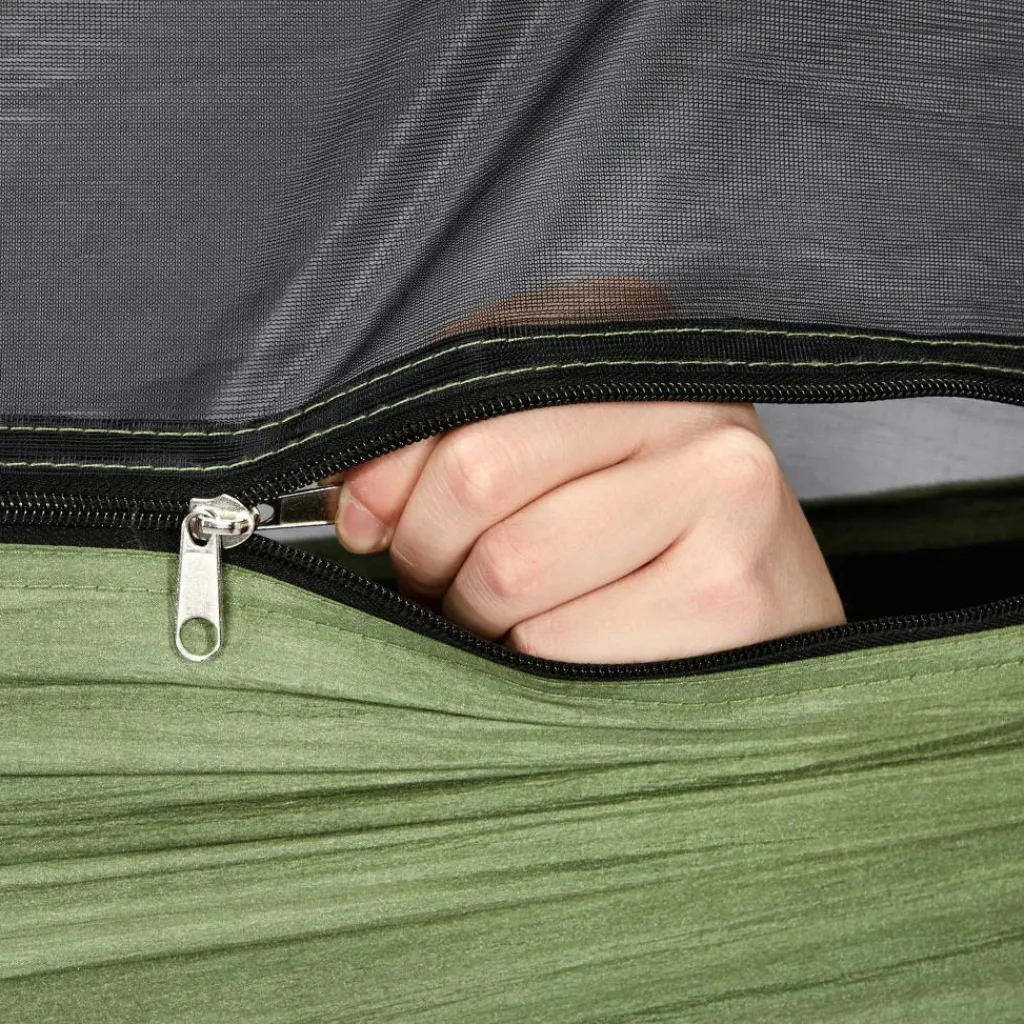 Der Einstieg in die Hängematte erfolgt über einen seitlich angebrachten Reißverschluss. An den anderen drei Seiten ist das Netz fest vernäht. Aufgespannt wird es mit einem Extraseil (inklusive). Praktisch: Der Mosquito Hammock kann schnell im angenähten Packbeutel verstaut werden und so platzsparend in deinem Rucksack mitgeführt werden.