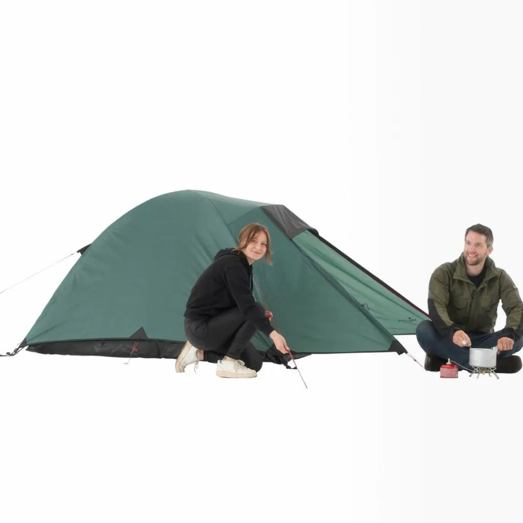 Günstiges Einsteigerzelt für zwei Personen, das sich ideal für erste Wanderungen und andere Outdooraktivitäten eignet. Der Innenraum ist großzügig bemessen und bietet zwei Personen ausreichend Platz.