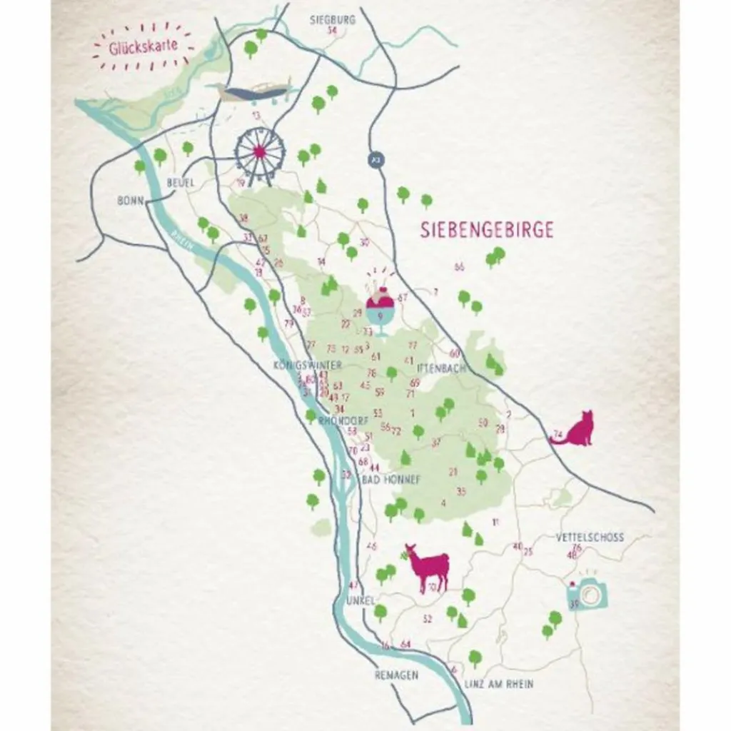 Mondscheinwiese, Nachtigallental, Herzbaum und Seufzerbrücke – das Siebengebirge verwöhnt die Sinne! Friedliches Blätterrauschen und wildromantische Täler locken nach draußen. Gleich siebenmal so gut schmecken hausgemachtes Eis und naturbelassener Honig. Malerische Weitblicke entspannen die Seele, urige Weinstuben sorgen für gemütliche Stunden und Geschichten um Burgen versprühen Magie. Wer von diesem Elixier des Glücks gekostet hat, findet immer den Weg hierhin zurück.