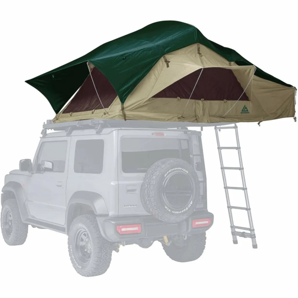Das Dachzelt besteht aus einem robusten und atmungsaktiven Ripstop–Mischgewebe mit Biobaumwollanteil und eignet sich besonders für warme, trockene Regionen. Der Aufbau gelingt in wenigen Minuten: Zelt ausklappen, Eingang abspannen, Fenster sichern – schon ist dein Schlafplatz bereit. Die mitgelieferte Memory Foam Matratze mit Flanellbezug sorgt für angenehmen Liegekomfort, während die 3D Airmesh Matte darunter eine gute Luftzirkulation gewährleistet und Kondenswasser vorbeugt.