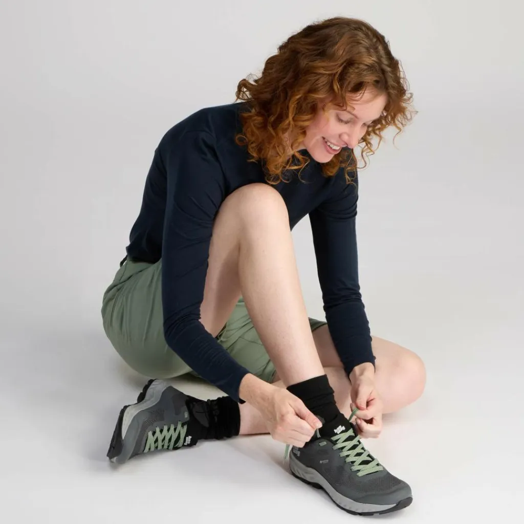 Außerdem verfügt der sportliche Wanderschuh selbstverständlich über eine Gore-Tex Membran. Und zwar die ePE-Version. Im Gegensatz zur bisher üblichen PTFE-Membran (für Chemiefans: Polytetrafluorethylen) wird beim Fertigungsprozess auf den Einsatz von PFAS-Chemikalien verzichtet. In puncto Wasserdichtigkeit und Atmungsaktivität musst du dir jedoch keine Sorgen über eine verringerte Leistungsfähigkeit machen. Die Werte bleiben die gleichen.