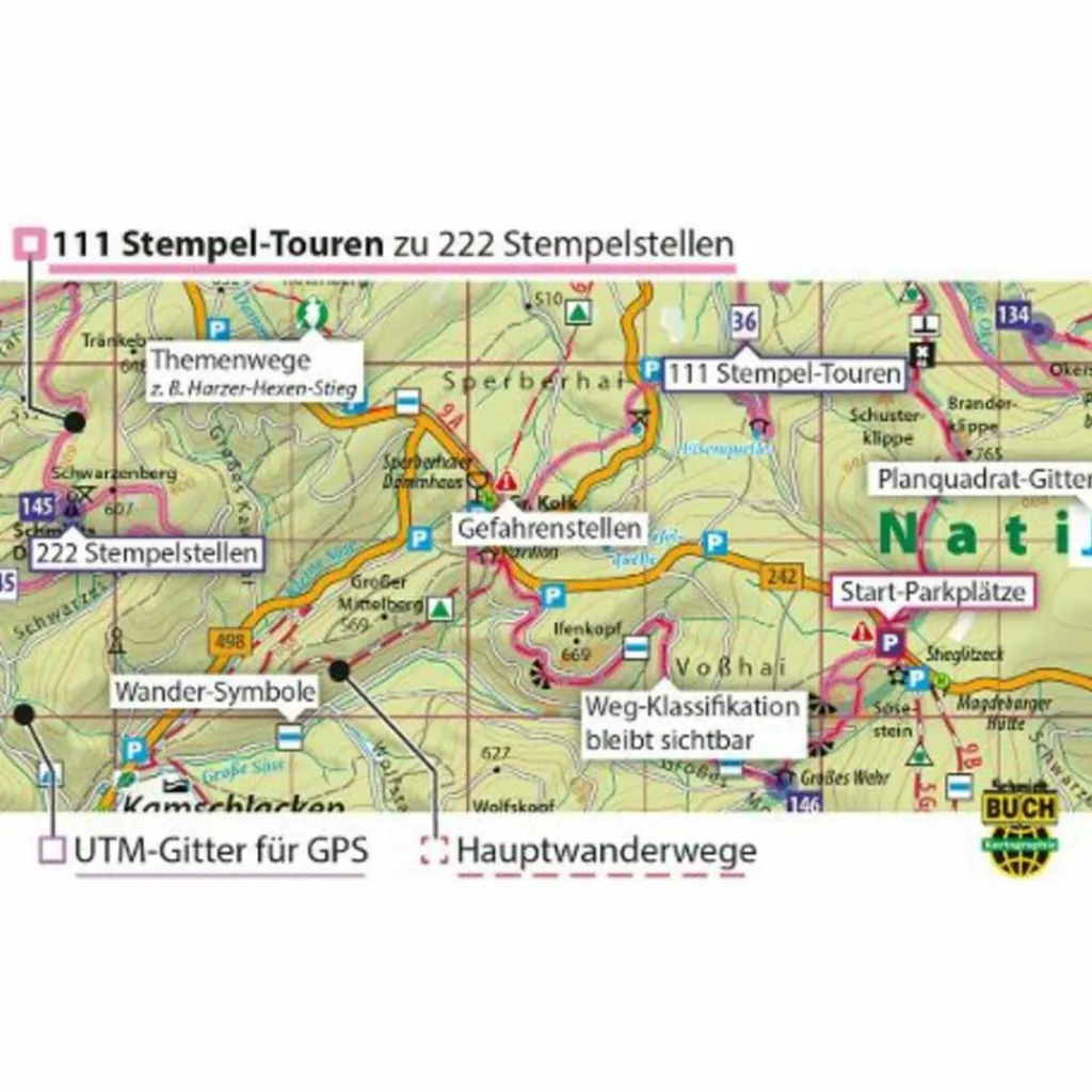 Das wasser- und reißfeste Premium-Material der offiziellen Tourenkarte „Harzer Wandernadel“ trotzt widrigsten Witterungsbedingungen. Der Spezialfalz ermöglicht eine komfortable Handhabung von beiden Seiten, ohne das gesamte Blatt komplett aufschlagen zu müssen. Außerdem erlaubt die strapazierfähige Folie ein kreatives Falzen durch den Benutzer auf den jeweils gewünschten Kartenausschnitt. So bleibt die Karte lange Zeit ein treuer Begleiter für Stempel-Touren im gesamten Harz.