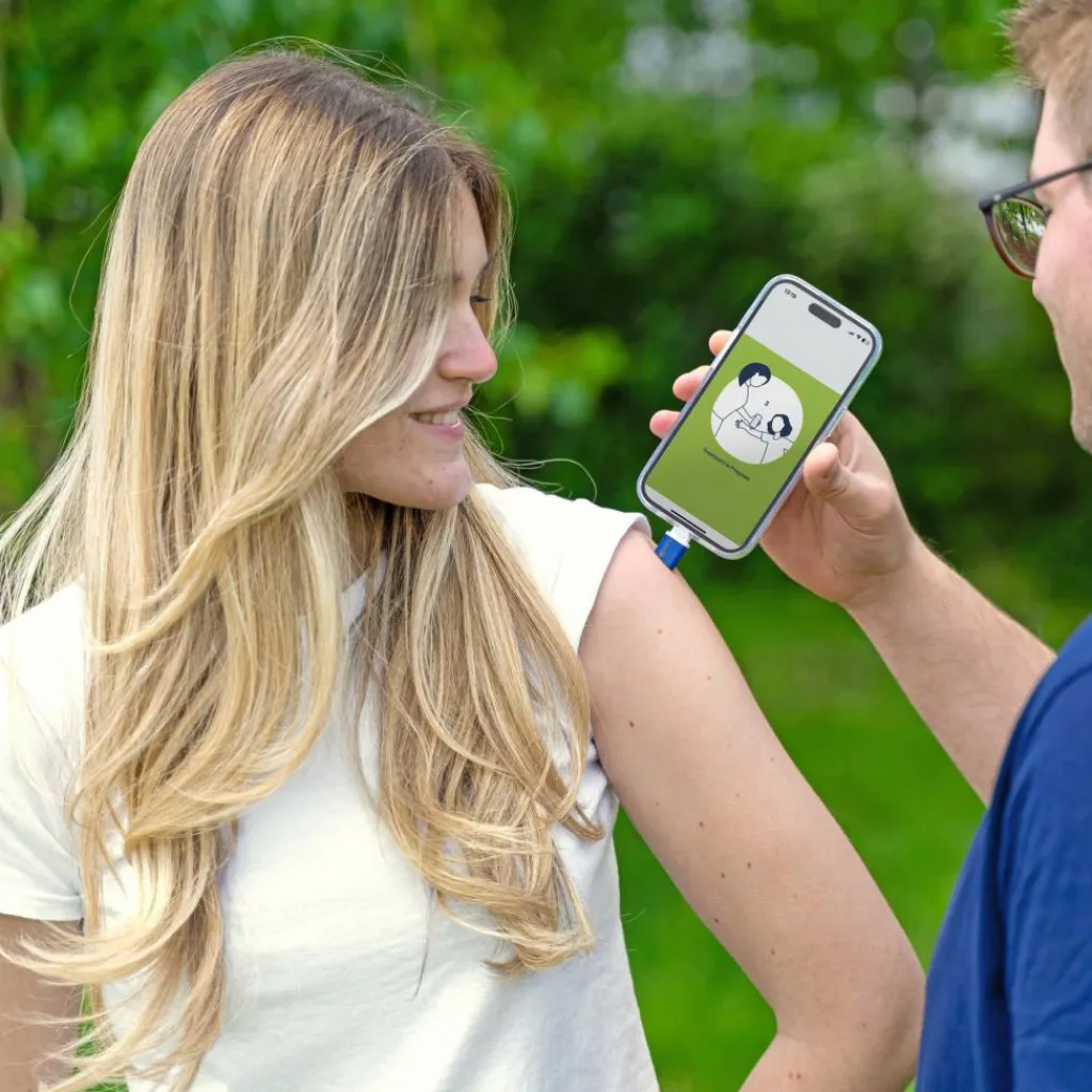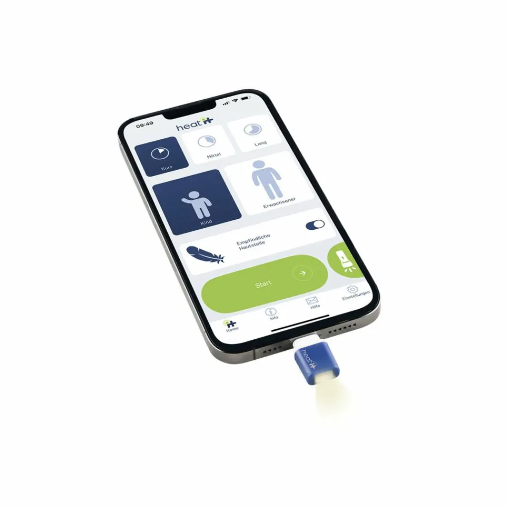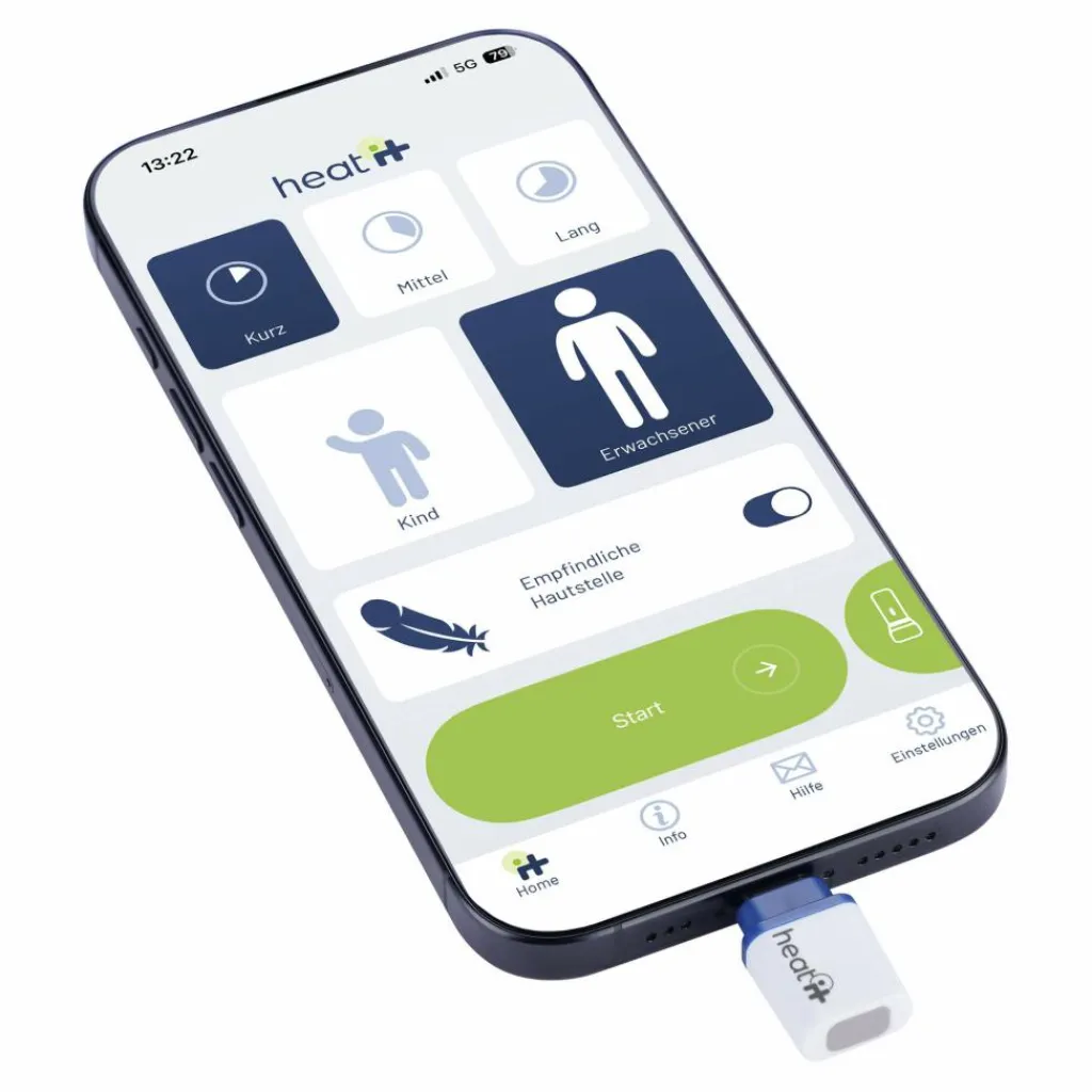 Steckst du den Heat it in den Ladeanschluss deines Handys, öffnet sich automatisch die Heat-it-App. Die App ist kostenlos für Apple und Android erhältlich und intuitiv bedienbar. Sie bietet dir 12 verschiedene Behandlungsoptionen, darunter auch spezielle Einstellungen für Kinder und empfindliche Hautstellen.