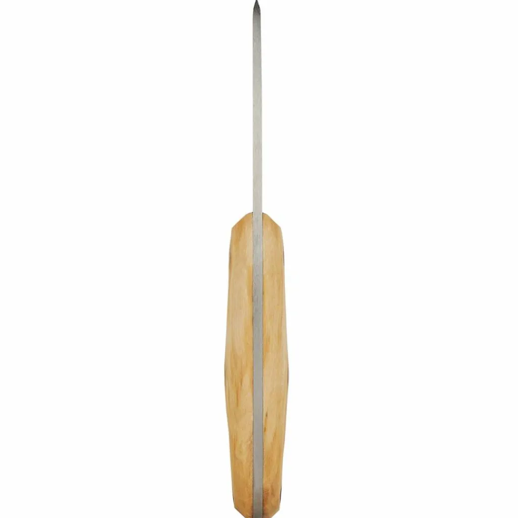Der satinierte Griff aus Maserbirke macht jedes Messer zu einem Unikat, denn keine Maserung gleicht der anderen. Um diese natürliche Schönheit zu betonen, wird der Griff von Hand poliert und geölt. Die beiden Griffschalen werden sicher durch dicke Messingnieten und eine Rohrniete am Griffende fixiert. Die Rohrniete dient gleichzeitig als Fangriemenöse, durch die du eine Kordel ziehen kannst.