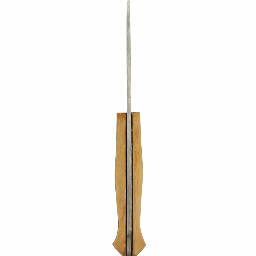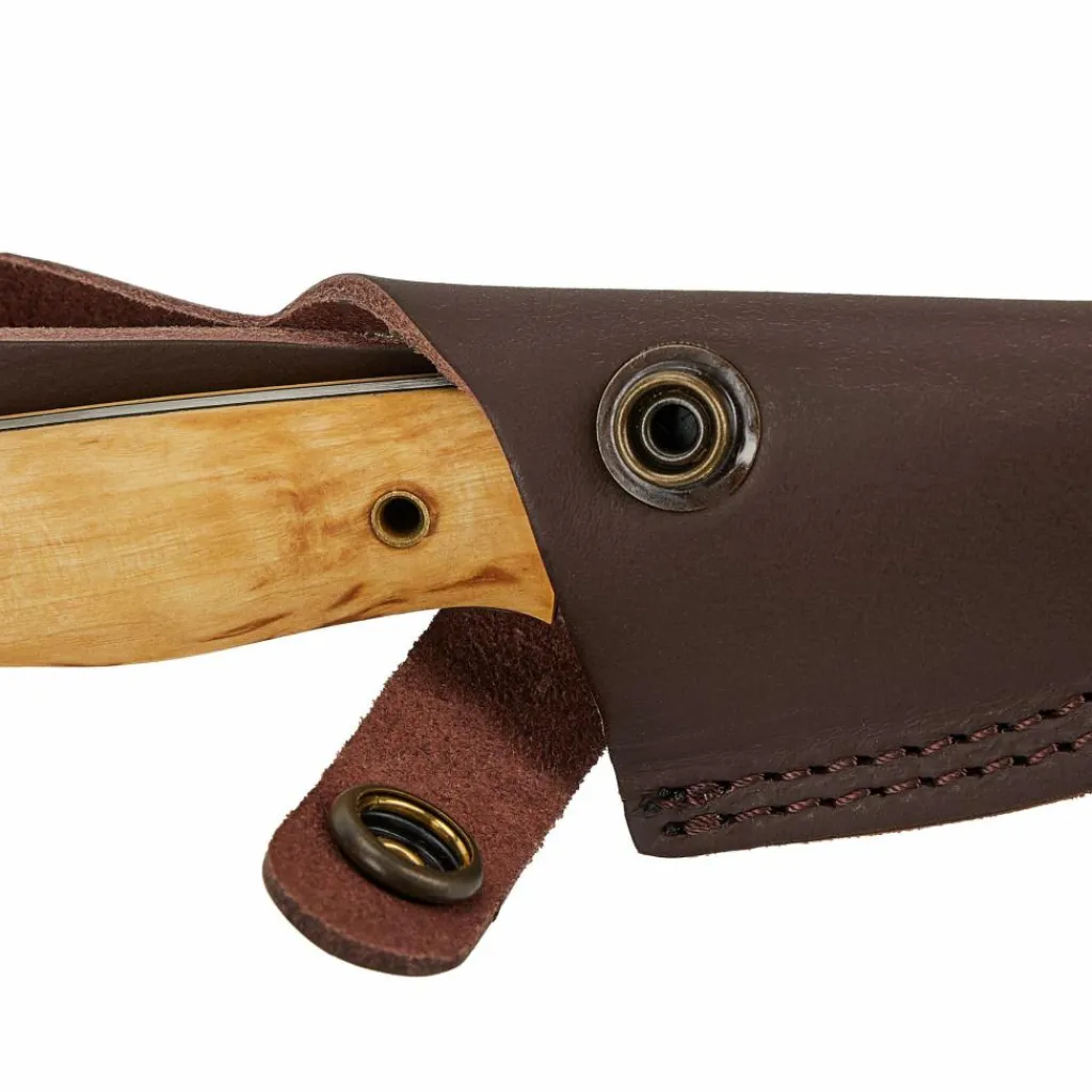 Gefertigt in Full-Tang-Bauweise, ist das Messer selbst für gröbere Aufgaben gewappnet. Die 6,9 cm lange und 2,6 mm dicken Klinge wird von einem Griff aus Birkenholz ergänzt, dessen Maserung durch polieren und Ölen sehr schön zur Geltung kommt. Der mit 8 cm Länge recht kurze Griff liegt überraschend gut in der Hand und kann von mittelgroßen und großen Händen als Drei-Finger-Griff verwendet werden.