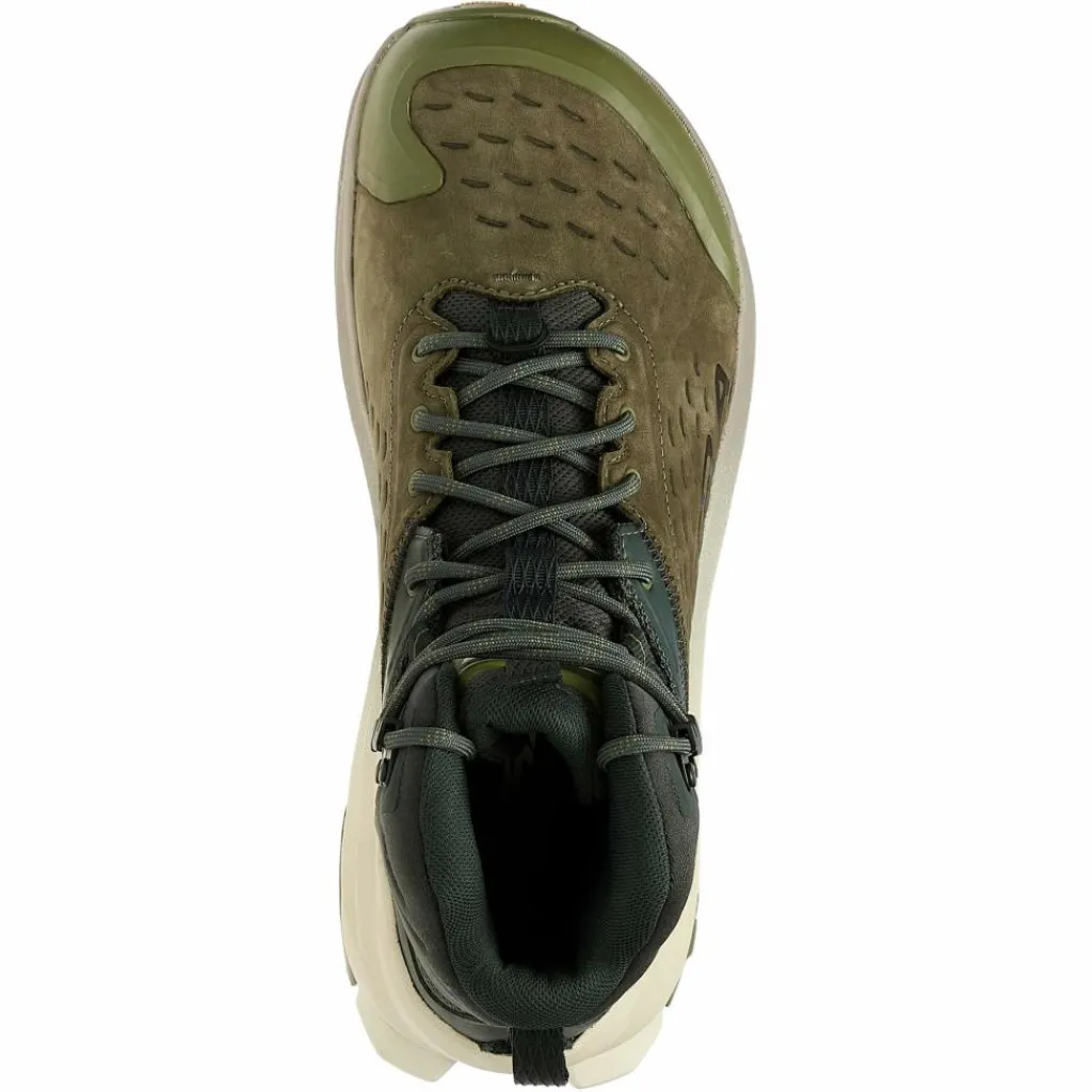 Als Obermaterial kommt beim Olympus Hike größtenteils solides Leder zum Einsatz, das teilweise durch luftiges Mesh-Gewebe ergänzt und unterstützt wird. Der sportliche Wanderstiefel ist trotz seiner „sanften“ Erscheinung aber auch für härtere Einsätze geeignet. So wird der Schuh im Zehenbereich durch eine hochwertige Schutzkappe aus robustem Gummi verstärkt, das an jenes von Kletterschuhen erinnert, also besonders abriebfest ist. Im Fersenbereich sorgt der nach oben gezogene Zwischensohlen-Rand aus EVA nicht nur für Schutz, sondern auch ein erhöhtes Maß an Dämpfung.