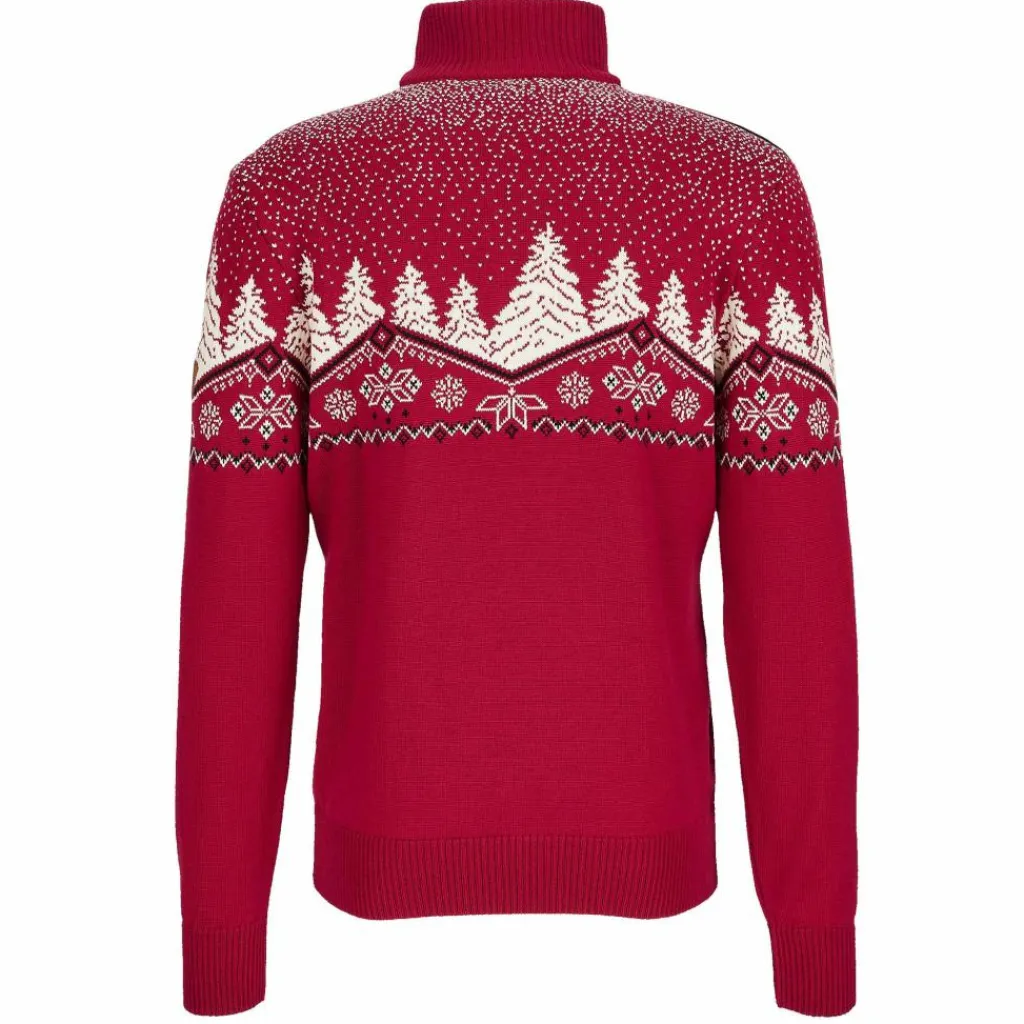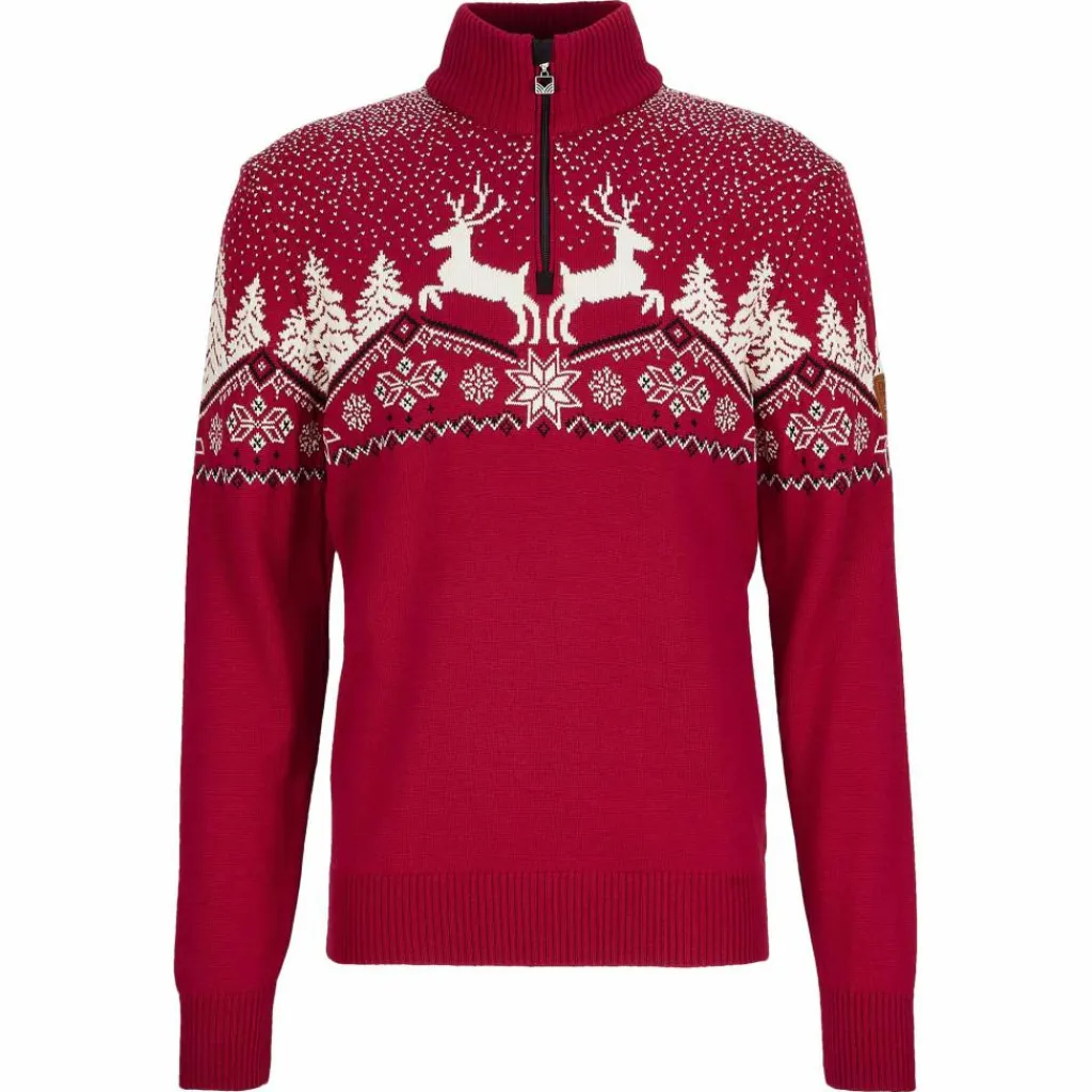 Mit seinem wirklich tollen Design passt der Sweater ideal in die Weihnachtszeit. Die beiden Rentiere vor der winterlichen Kulisse mit leichtem Schneegestöber versprühen die ideale Stimmung und passen perfekt in die kalten Monate. Auch norwegische Tradition ist auf dem Dale Sweater zu finden in Form der traditionellen achblättrigen Rose, die im Zentrum des Pullovers ihren Platz gefunden hat.