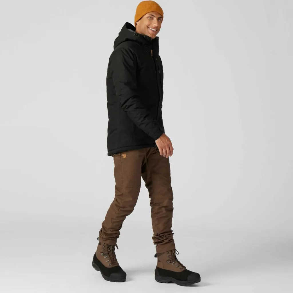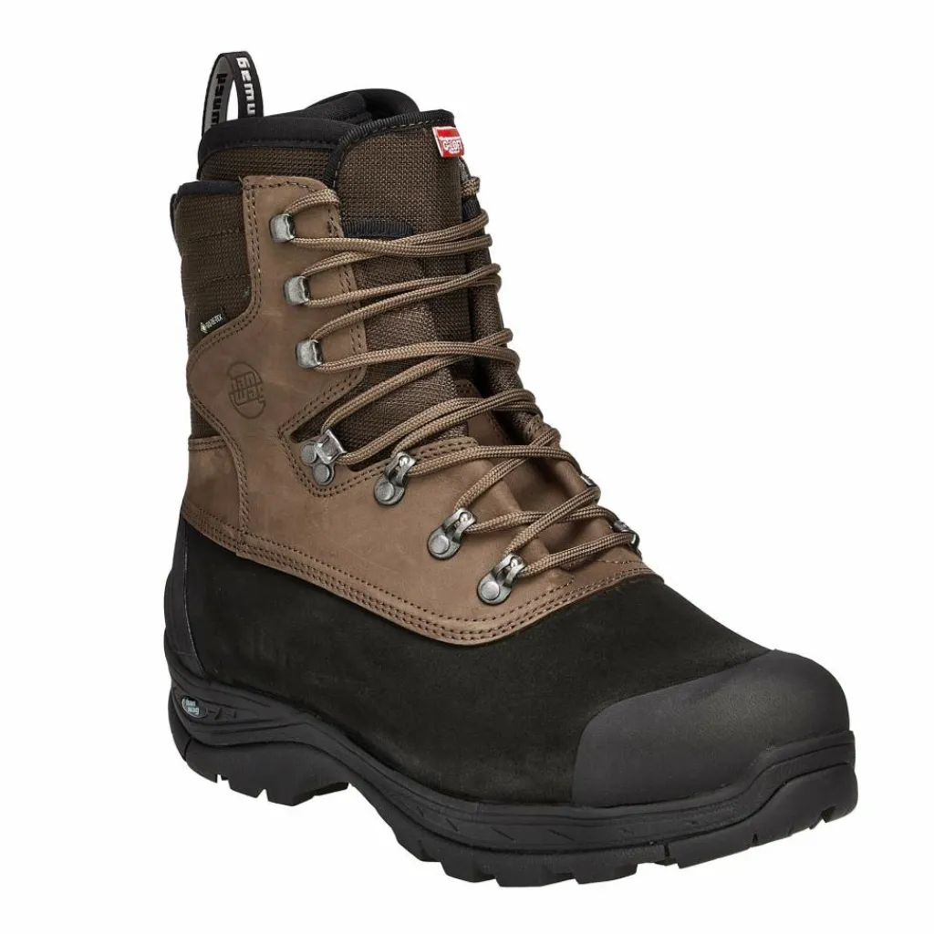 Der darüber liegende, robuste Winterstiefel ist aus Leder und strapazierfähigem Nylon gearbeitet. In den relevanten Zonen schützen Gummikappen; eine eingearbeitete Gore-Tex–Membran macht den Stiefel wasserdicht. Die Sohlenkonstruktion dämpft und stabilisiert gleichermaßen.