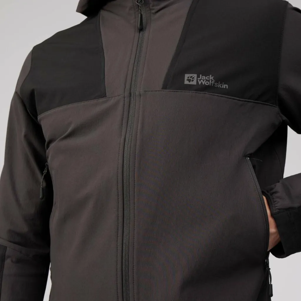 Die teilelastische Kapuze mit Schirm hält dir lästige Wassertropfen aus dem Gesicht. Für mehr Tragekomfort und weiteren Windschutz sorgen der unterlegte Reißverschluss mit Kinnschutz und der einstellbare Saum. Die beiden RV-Taschen sind extra höher angebracht, sodass du sie auch mit Rucksackgurten problemlos erreichen kannst. In den Taschen befindet sich ein Meshfutter, welches ein wenig frische Luft verschaffen kann.