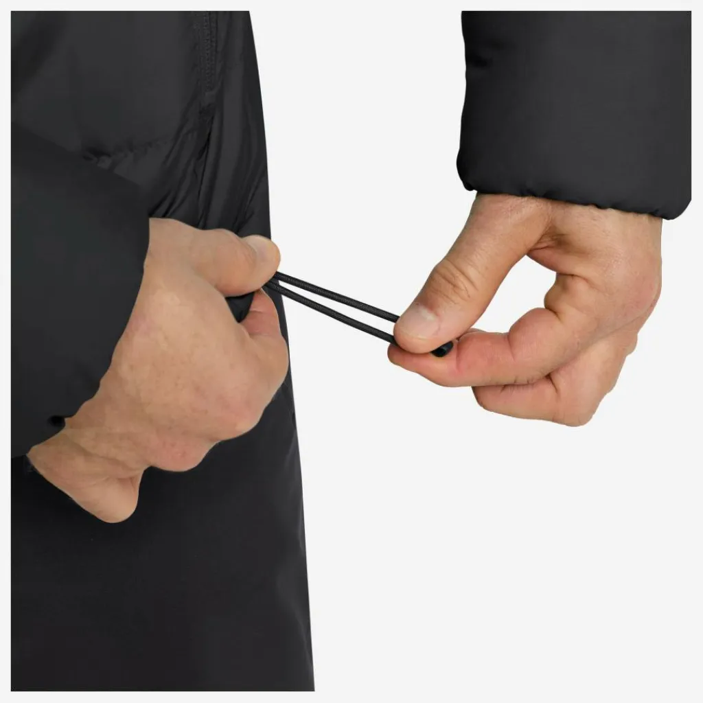 Den Saum kannst du über einen Schnürzug deinen Bedürfnissen anpassen. Der durchgehende Reißverschluss ist unterlegt, sodass es Wind und Kälte auch hier schwer haben. Für schnell erreichbare Habseligkeiten ist die Daunenjacke mit zwei seitlichen RV-Taschen ausgestattet. Sie lässt sich zudem sehr leicht verstauen.
